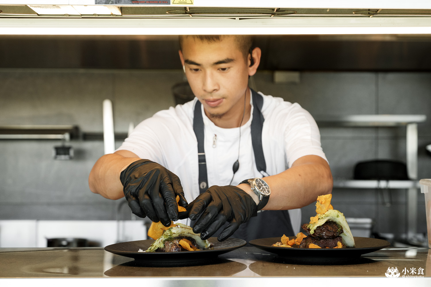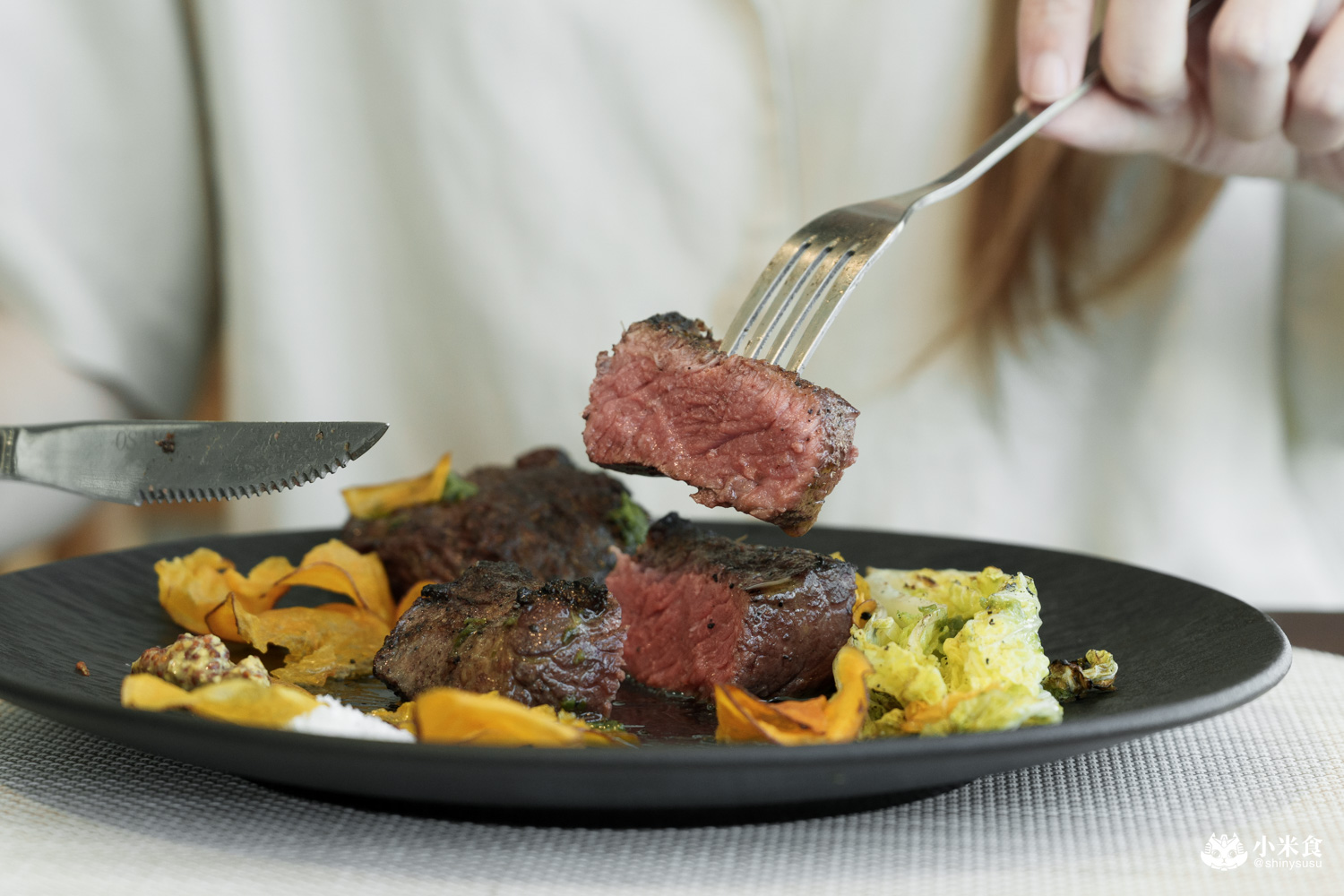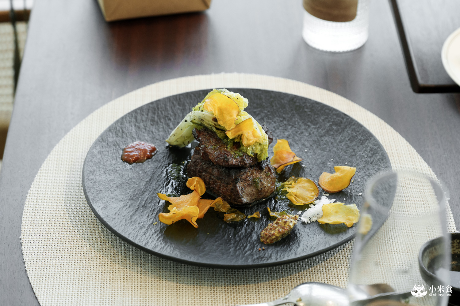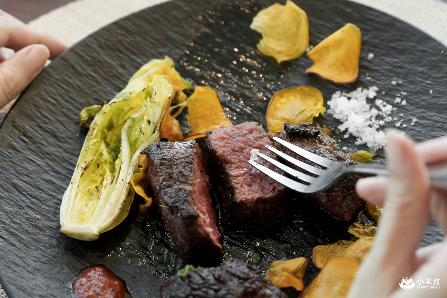 直火炭燒的肋眼牛排,經靜置處理鎖住美味,擺盤粗獷野性美,美味細膩講究,兩者反差萌是柴燒料理的精髓