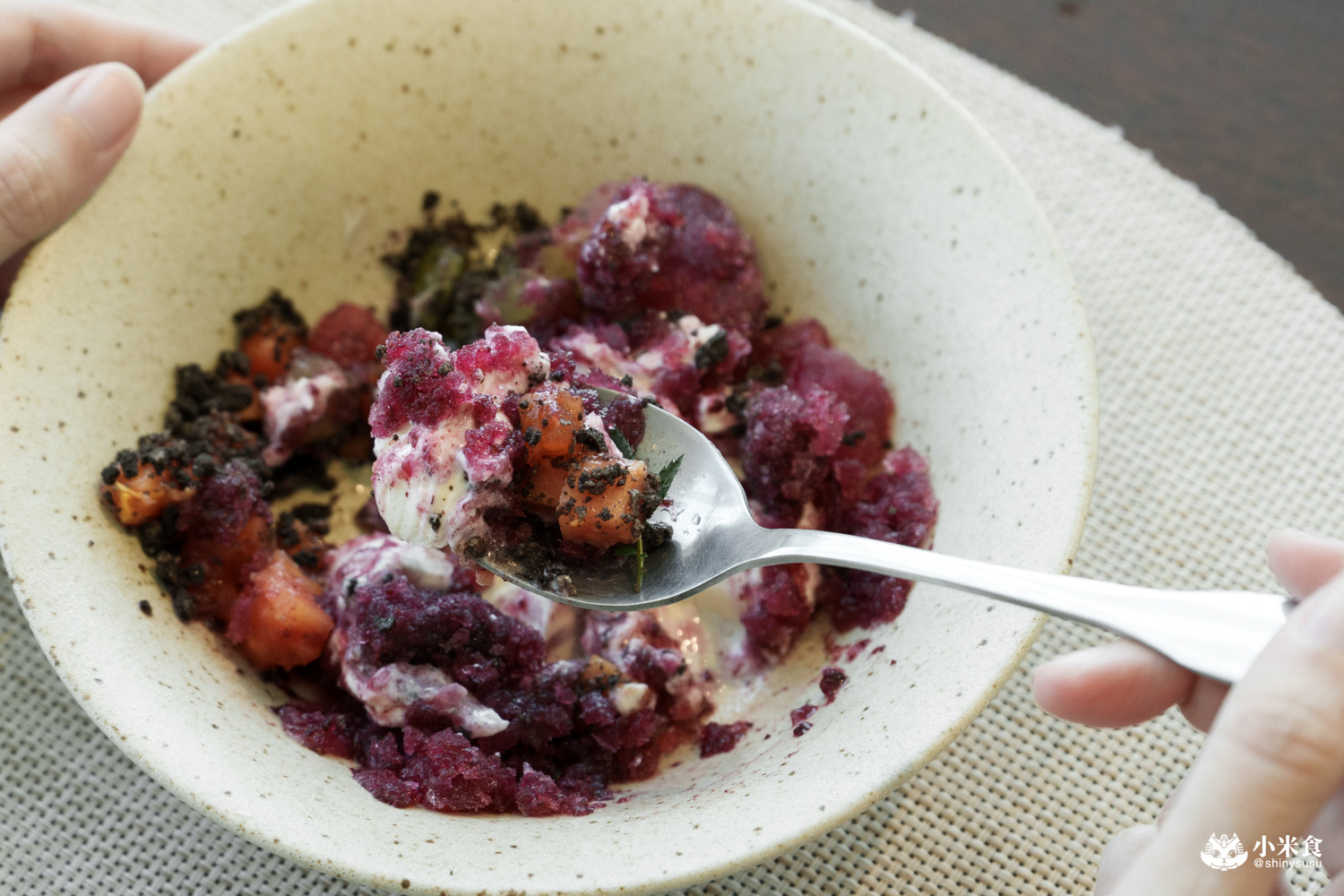 以豪邁之姿暴力攪拌冰爽優格、莓果冰沙、當季水果與可可碎,萬壽菊香氣是點睛靈魂,入口後,夏日熱浪一秒沖散