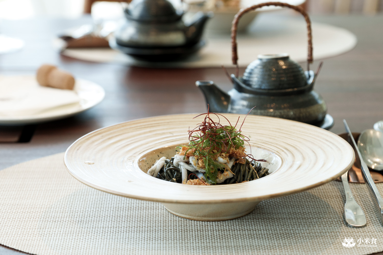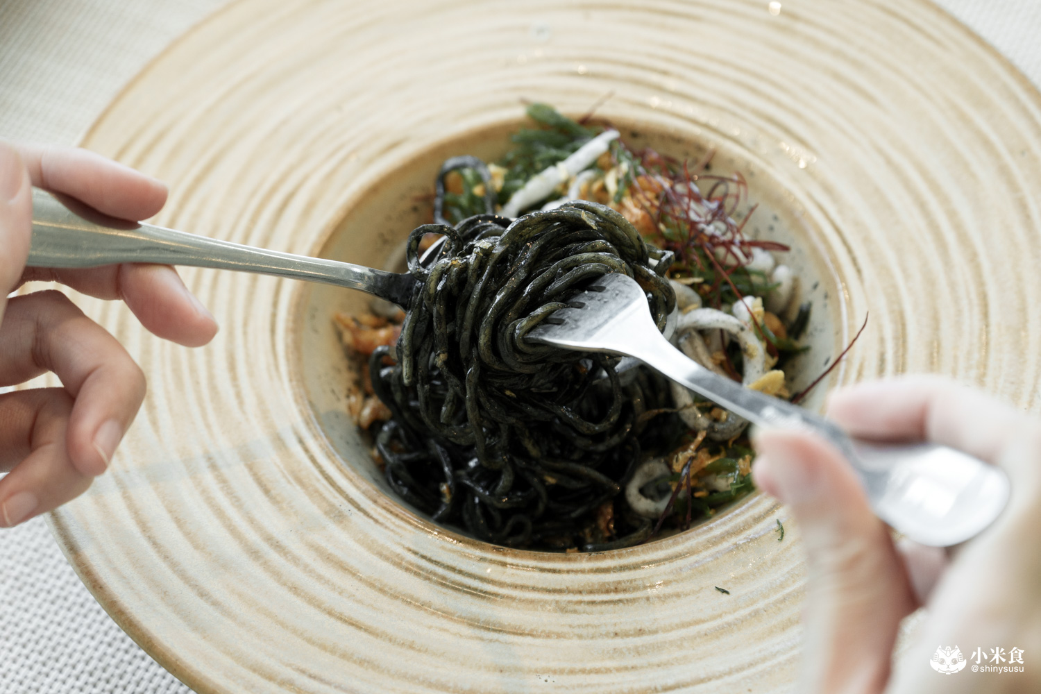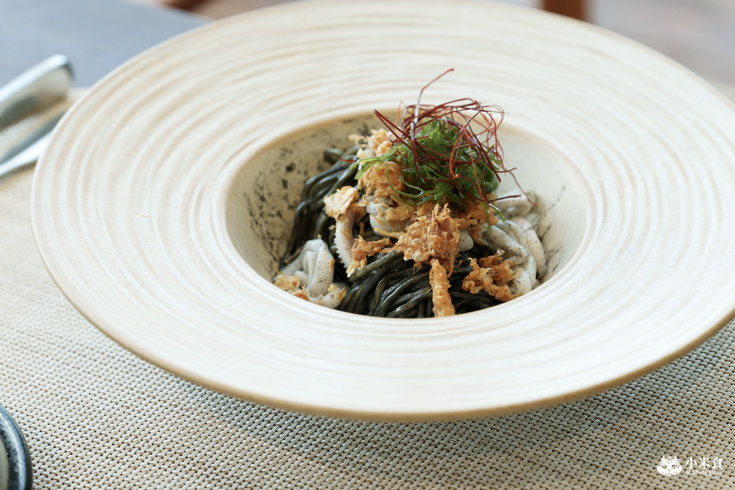 將墨色麵體鎖住海味鮮美,佐靈魂配角豬油煸過的紅蔥酥和蛋酥來還原古早味;