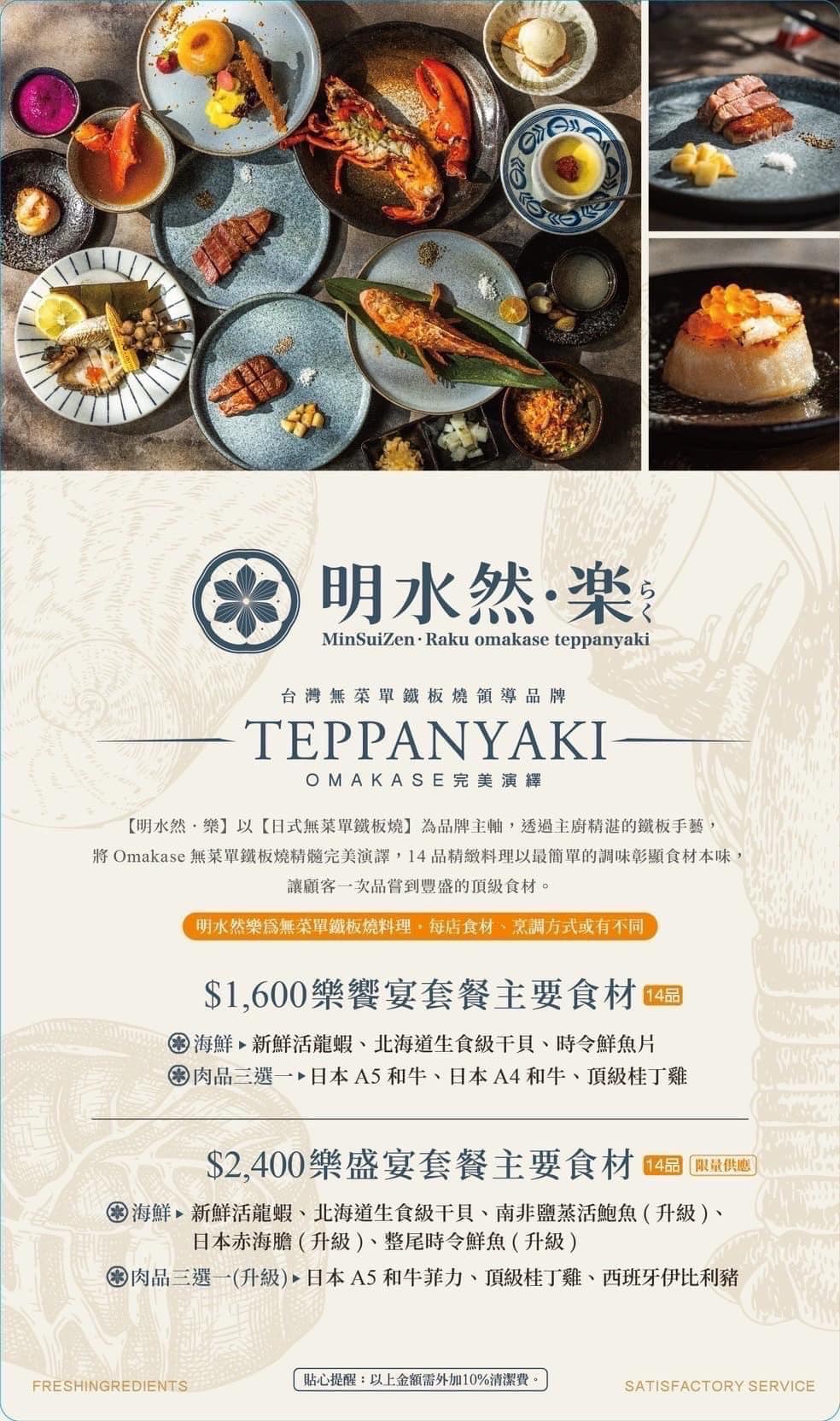 | ▸ 無菜單價格 | 明水然樂鐵板燒 14 道無菜單料理套餐,每人$1600 元+10% |