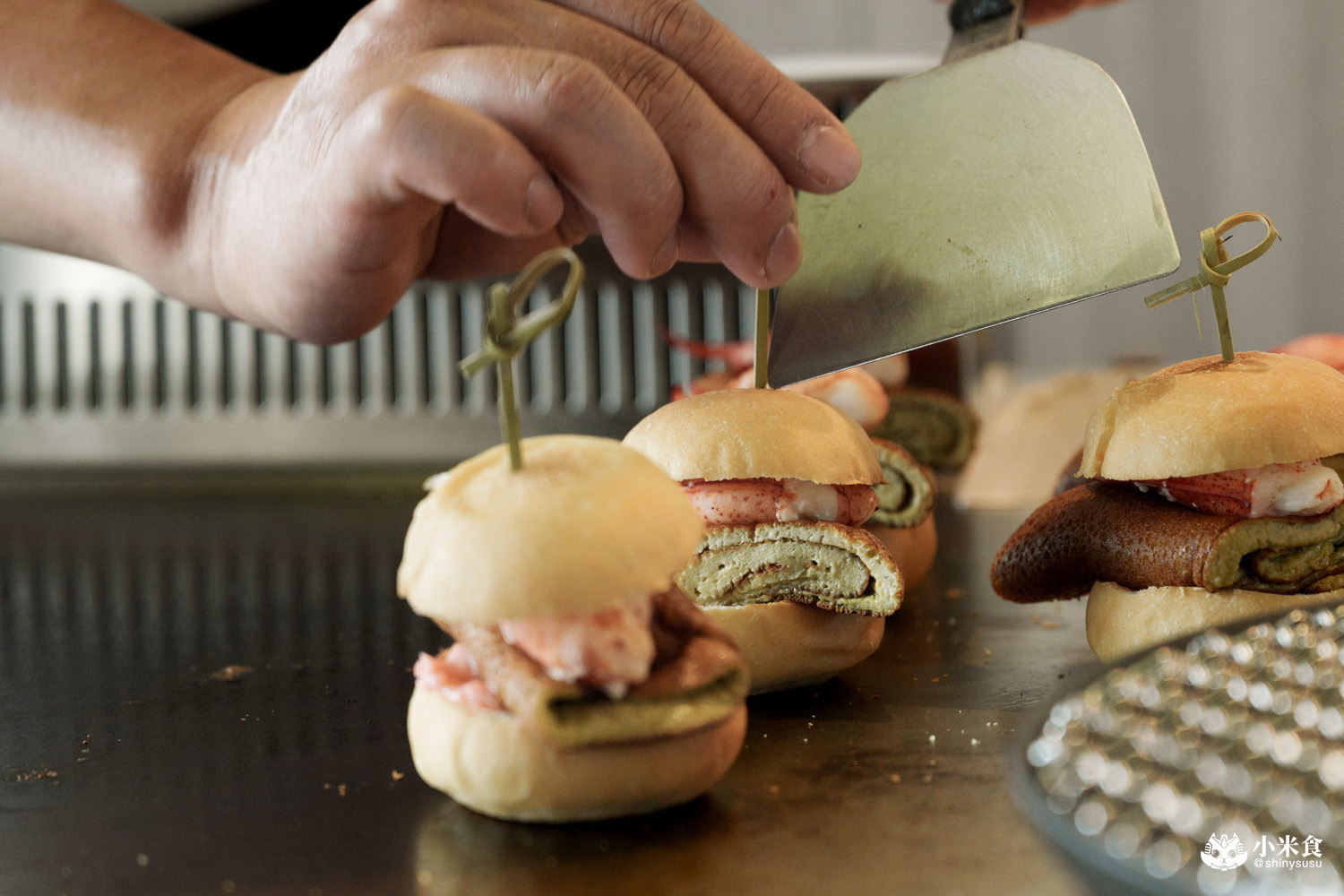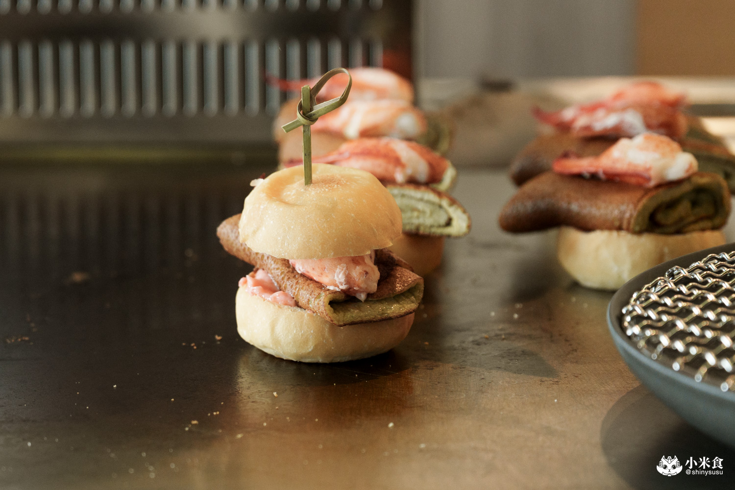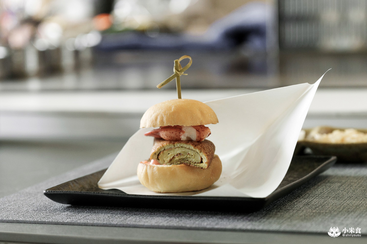 特製小漢堡麵包先上鐵板煎過並薄刷明太子醬,包夾入以蝦膏製成的香煎蛋捲與龍蝦螯,就成了明水然樂的特製美味蝦堡~