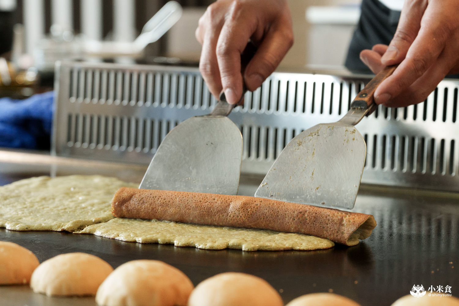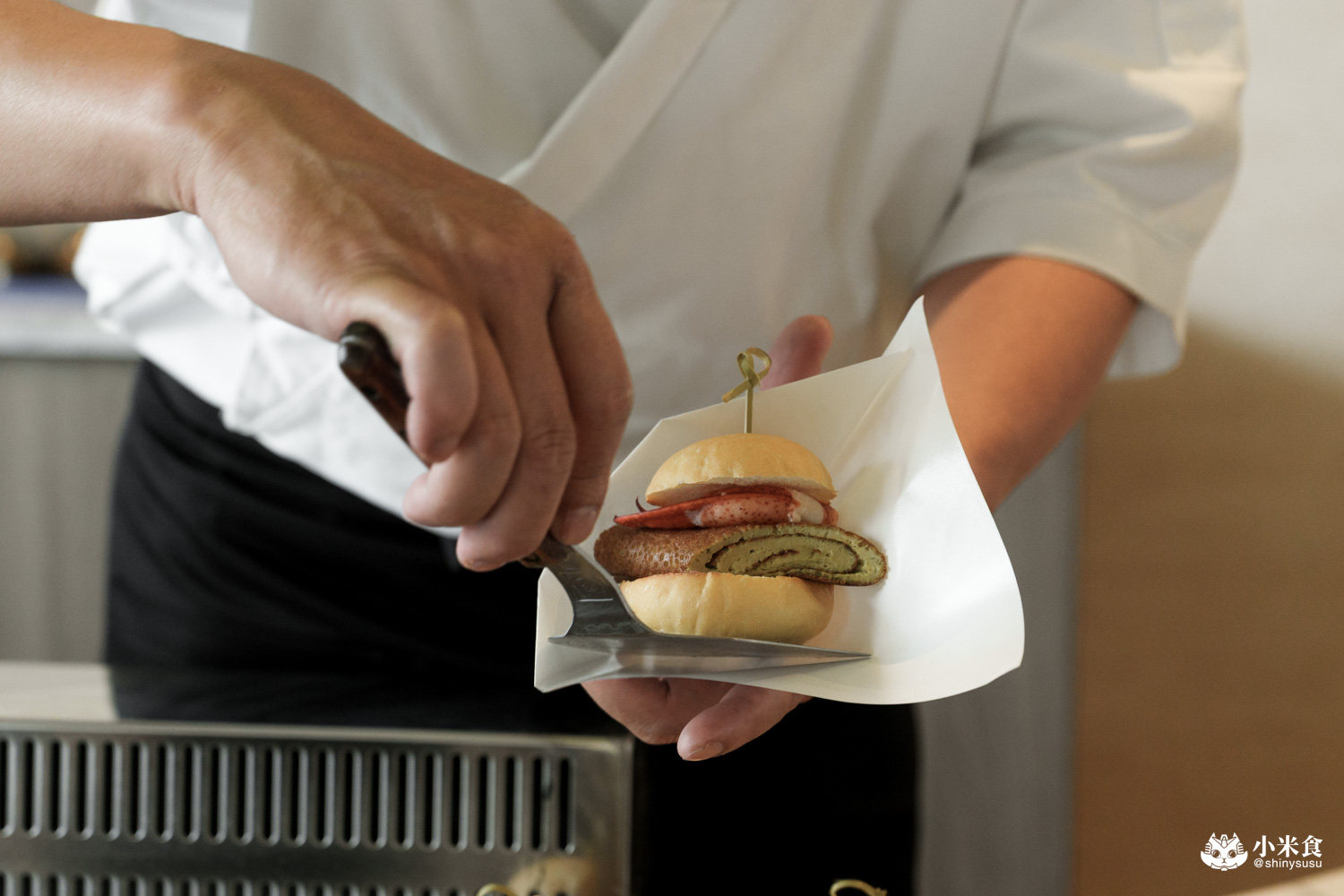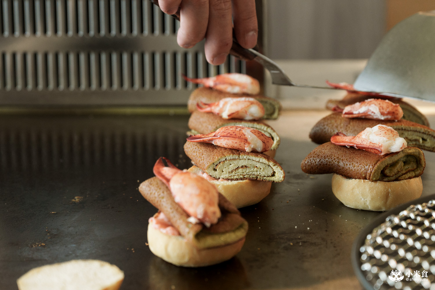 特製小漢堡麵包先上鐵板煎過並薄刷明太子醬,包夾入以蝦膏製成的香煎蛋捲與龍蝦螯,就成了明水然樂的特製美味蝦堡~