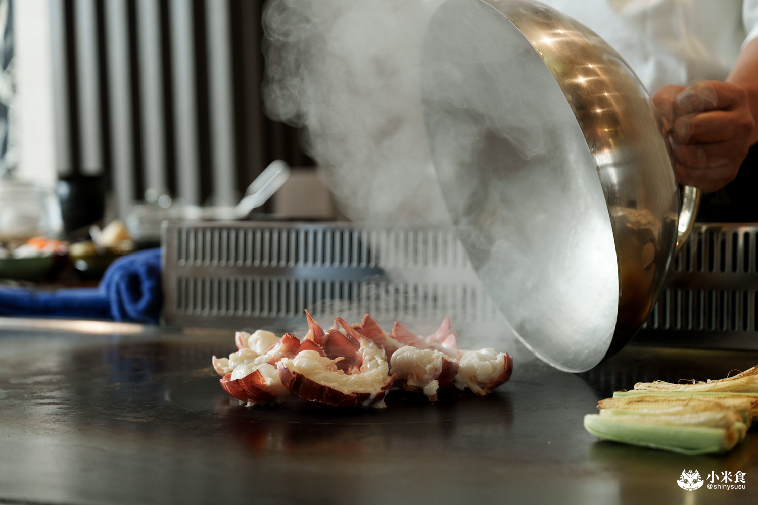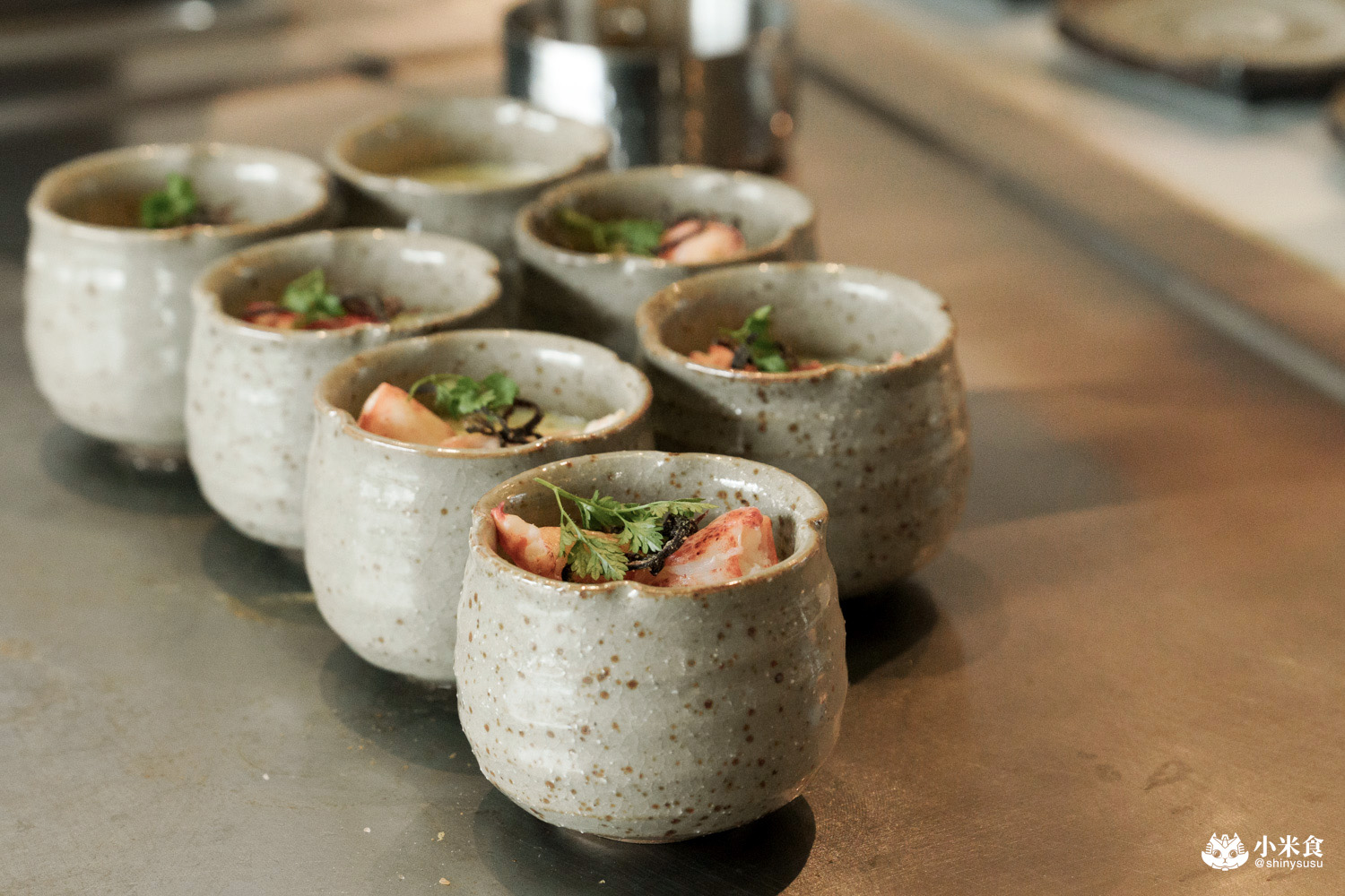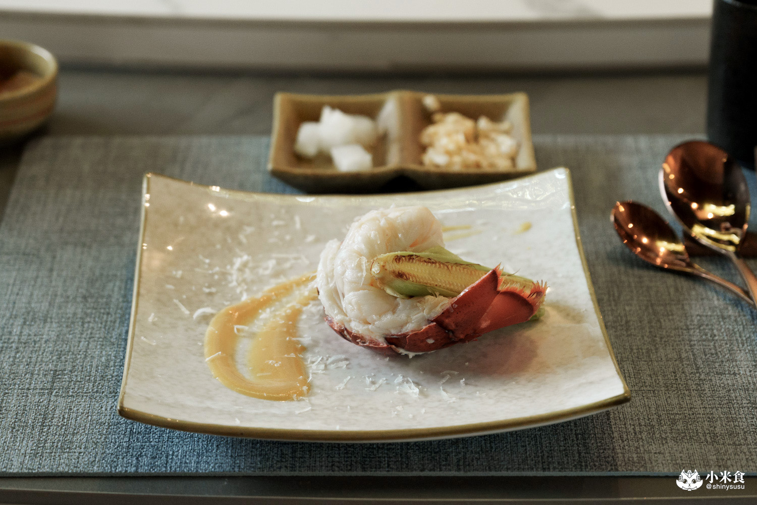 明水然樂鐵板燒提供經典的龍蝦三吃,率先登場的是龍蝦茶碗蒸~以龍蝦背肉為主角,結合甘甜的柴魚高湯,鑲昆布鹽和山葡萄葉鮮香點綴,