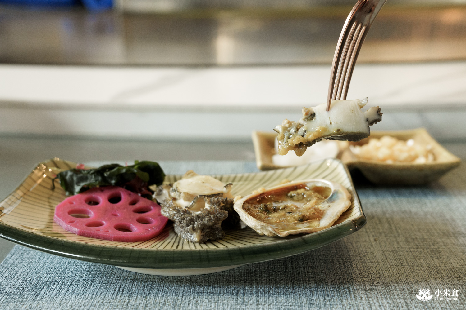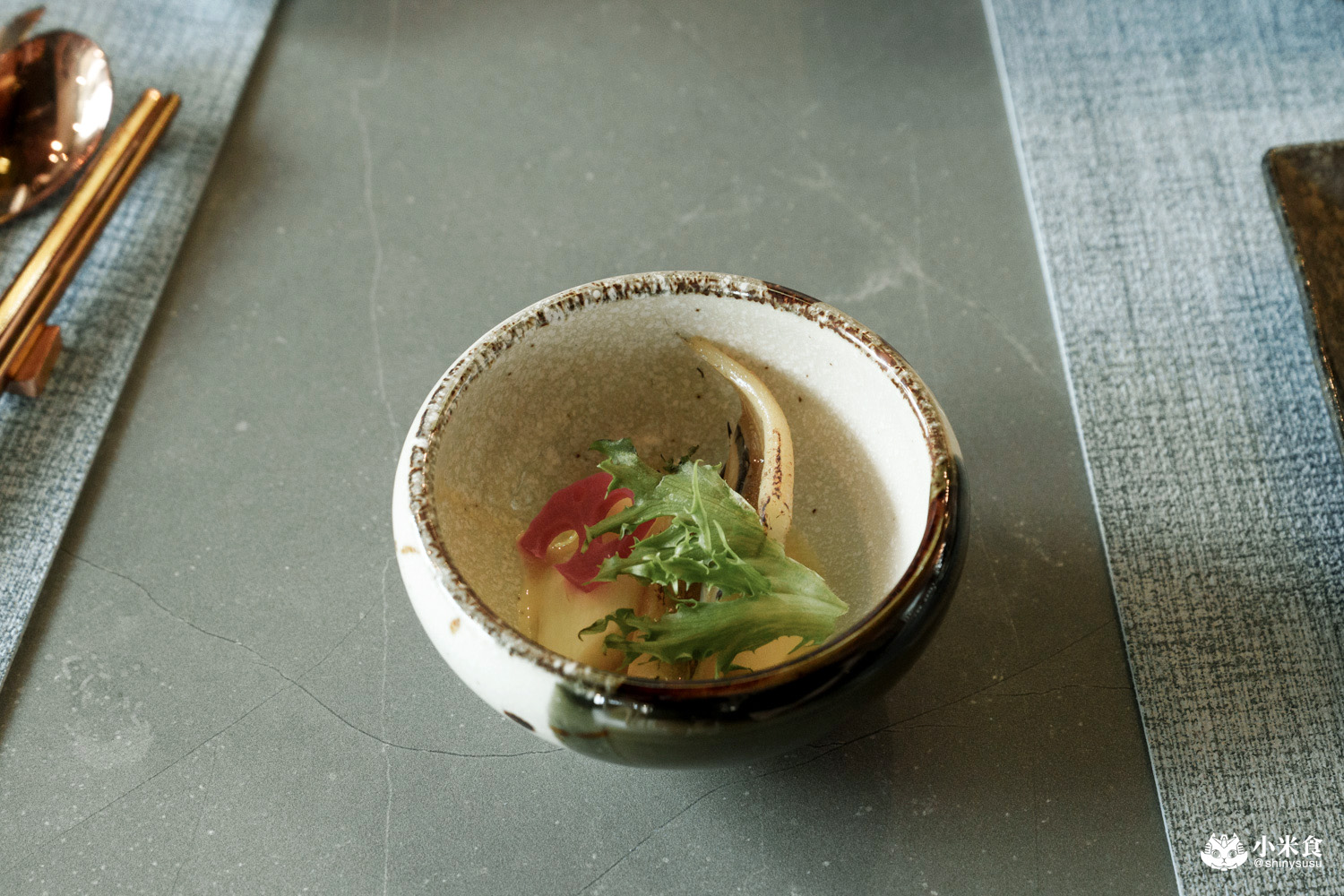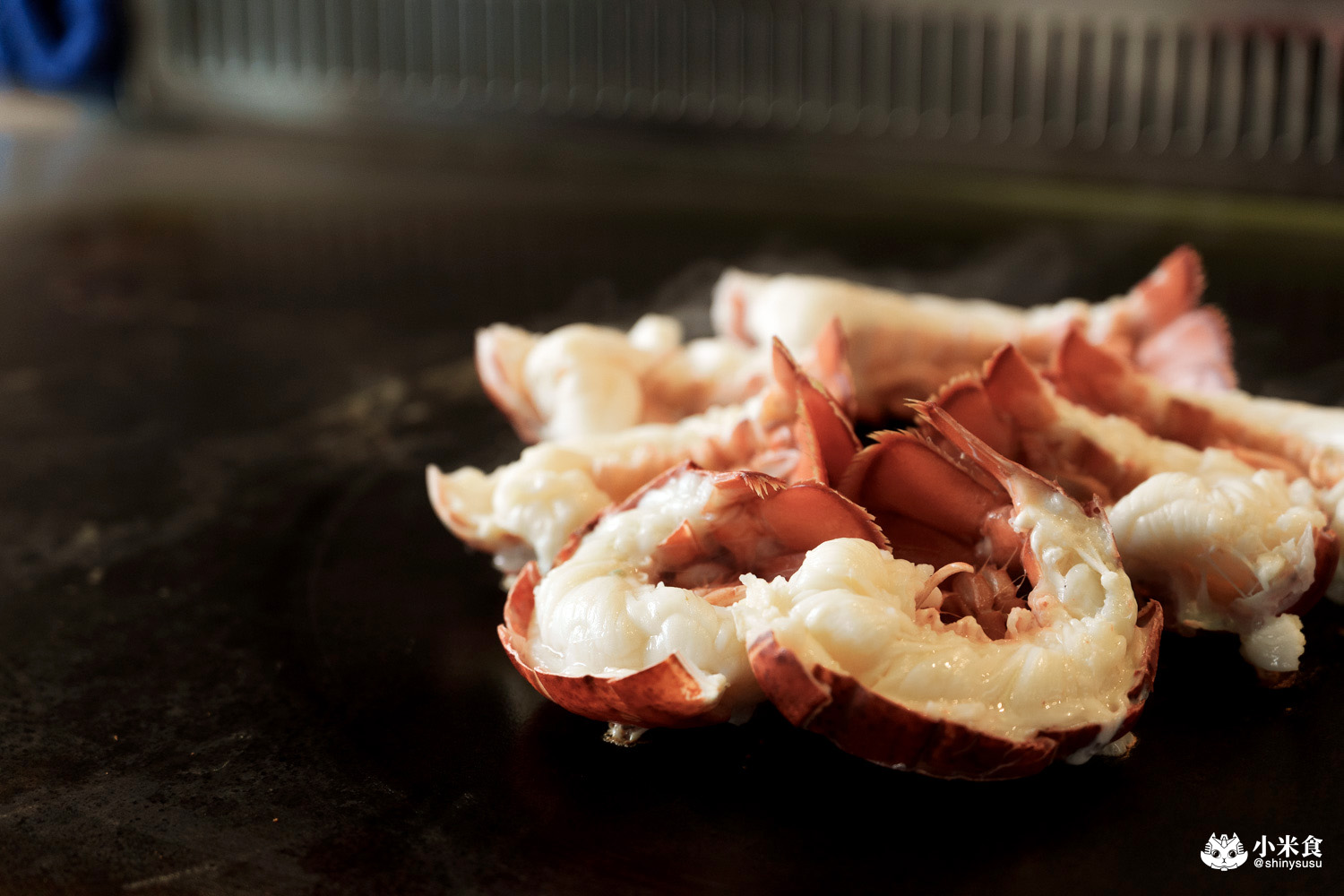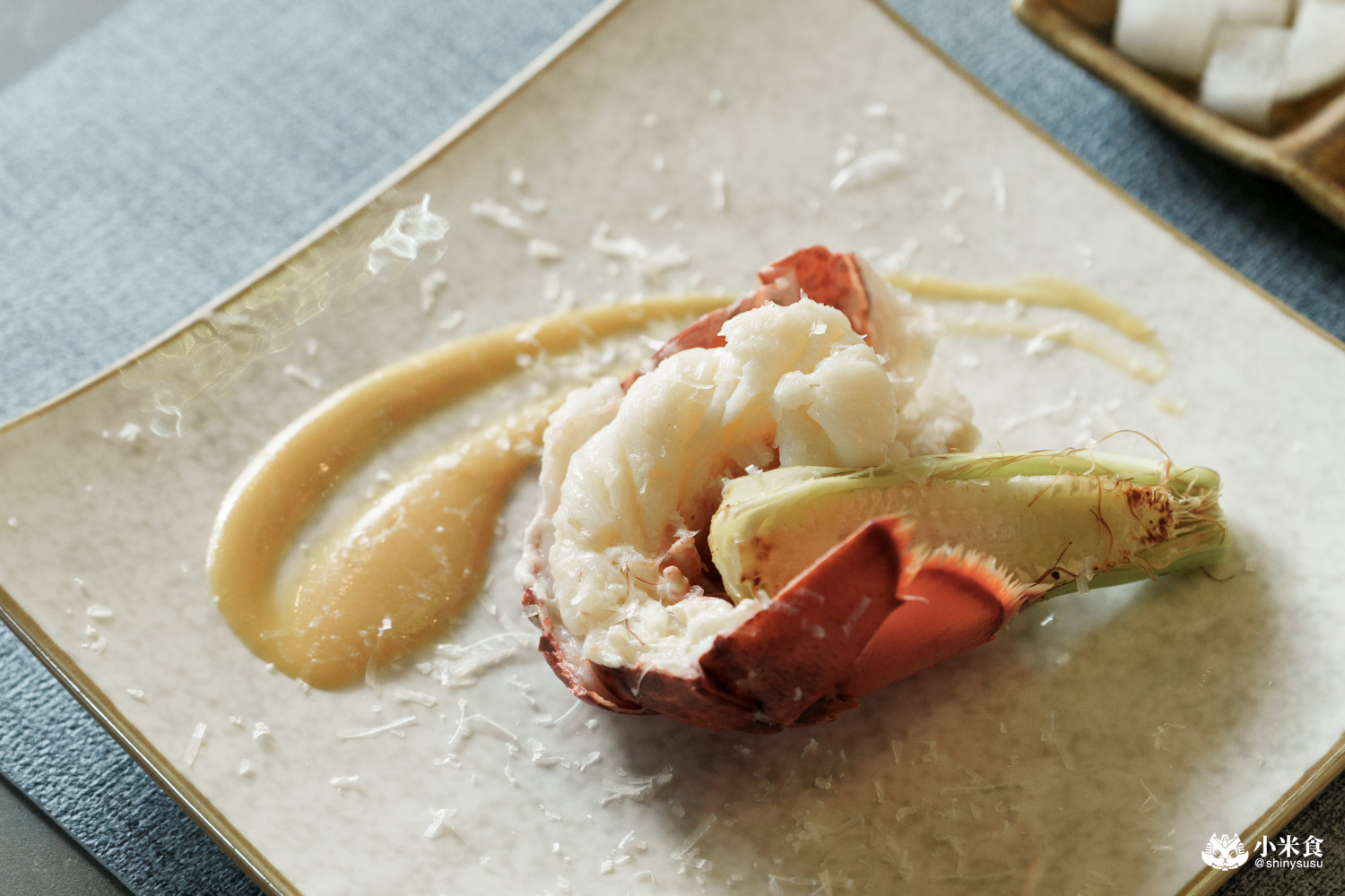 明水然樂鐵板燒提供經典的龍蝦三吃,率先登場的是龍蝦茶碗蒸~以龍蝦背肉為主角,結合甘甜的柴魚高湯,鑲昆布鹽和山葡萄葉鮮香點綴,
