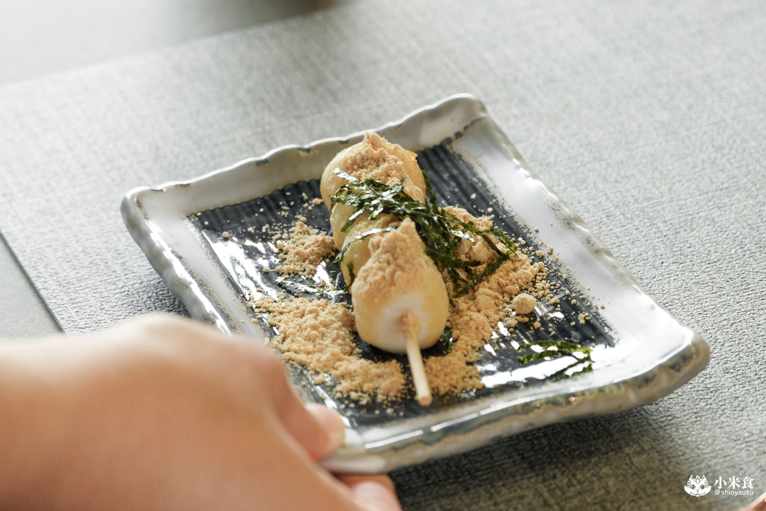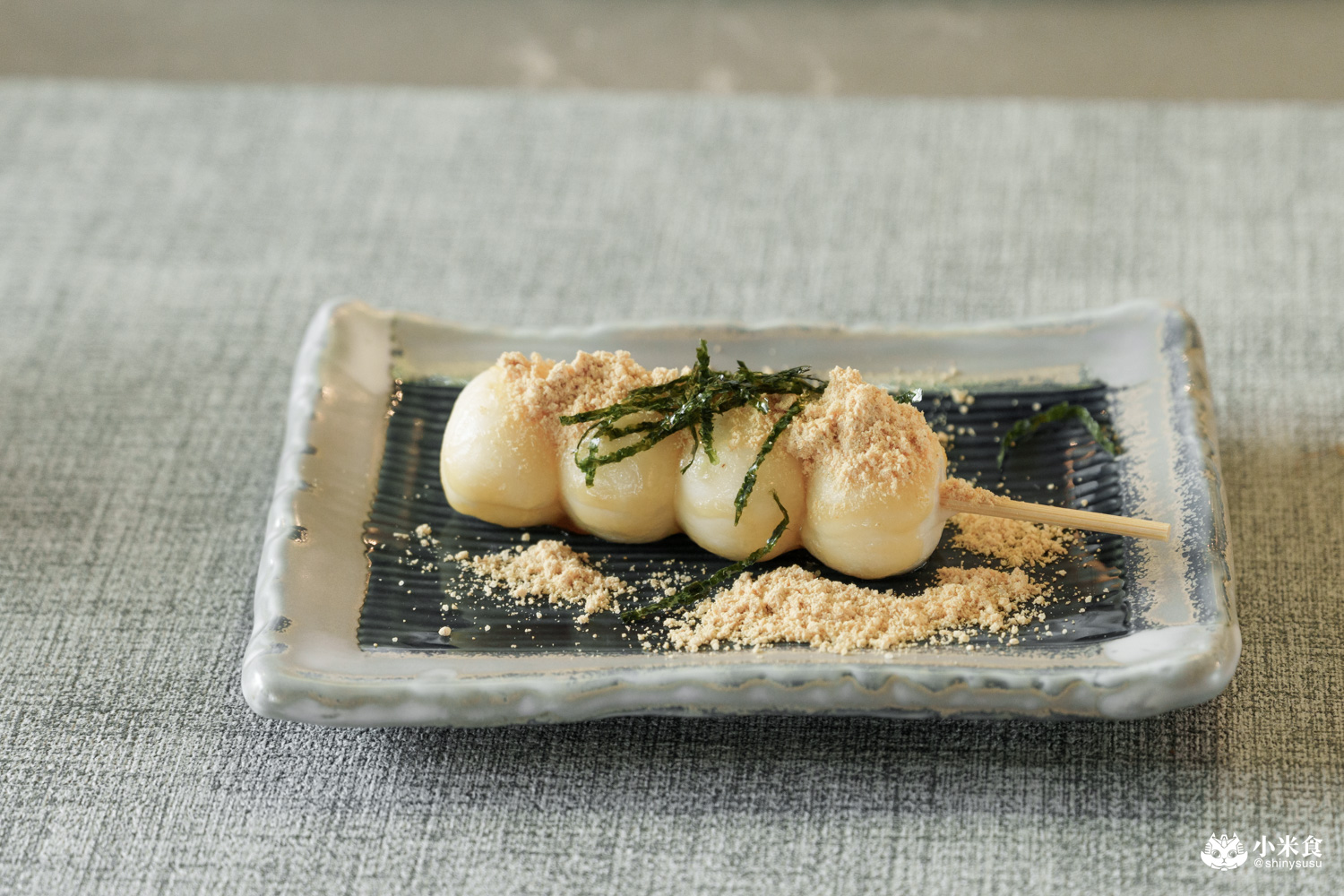 咀嚼鹹鹹甜甜且酥軟黏Q,搭配黃豆粉和海苔絲非常舒服,米蠻喜歡這串收尾甜點的~