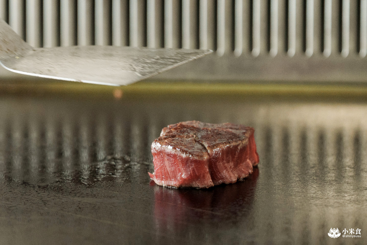 和牛菲力牛排有著很棒的嫩粉色光澤,靜置後待肉汁分布均勻後回煎分切,
