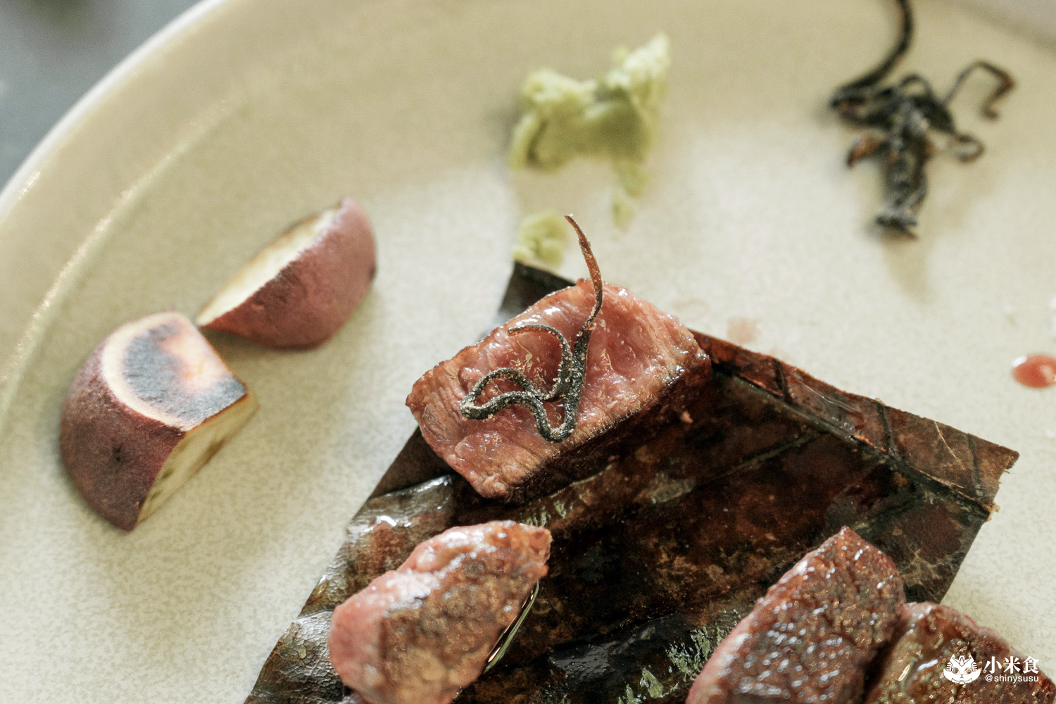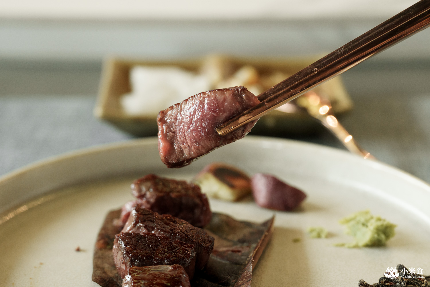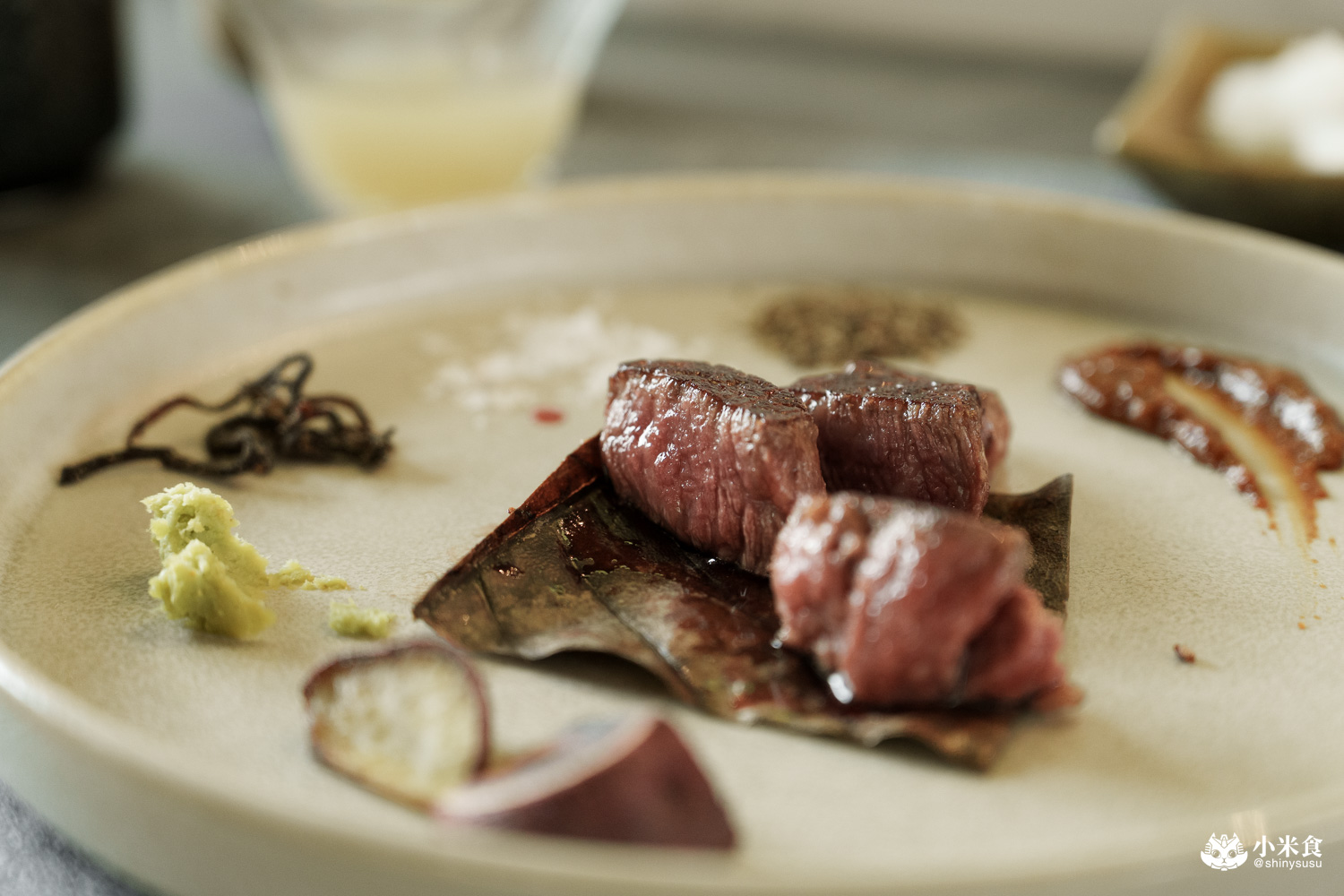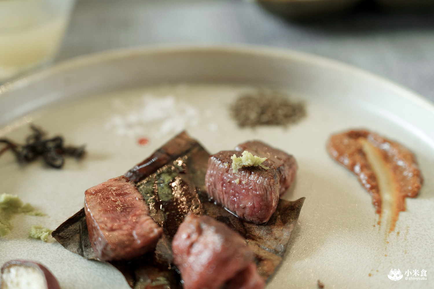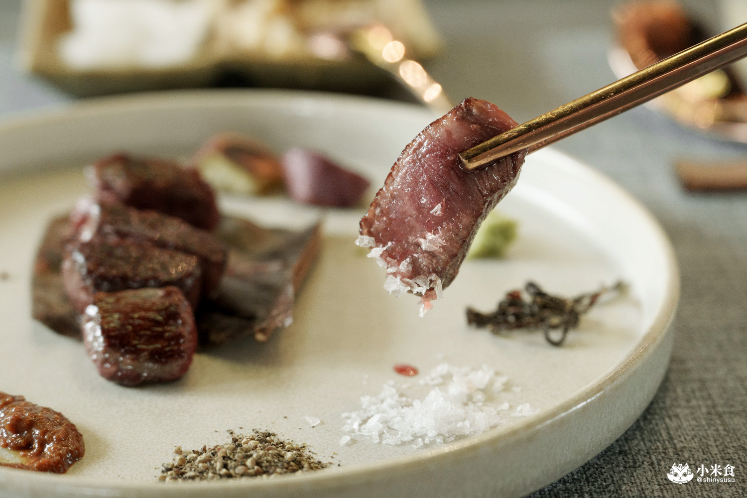 一口一塊剛剛好,咀嚼外酥內嫩且入口即化,牛排表現出的柔嫩口感與豐腴肉感,叫人不自覺嘴角上揚~搭馬爾頓片鹽提鮮是最愛,佐昆布鹽與芥末也對味極了!