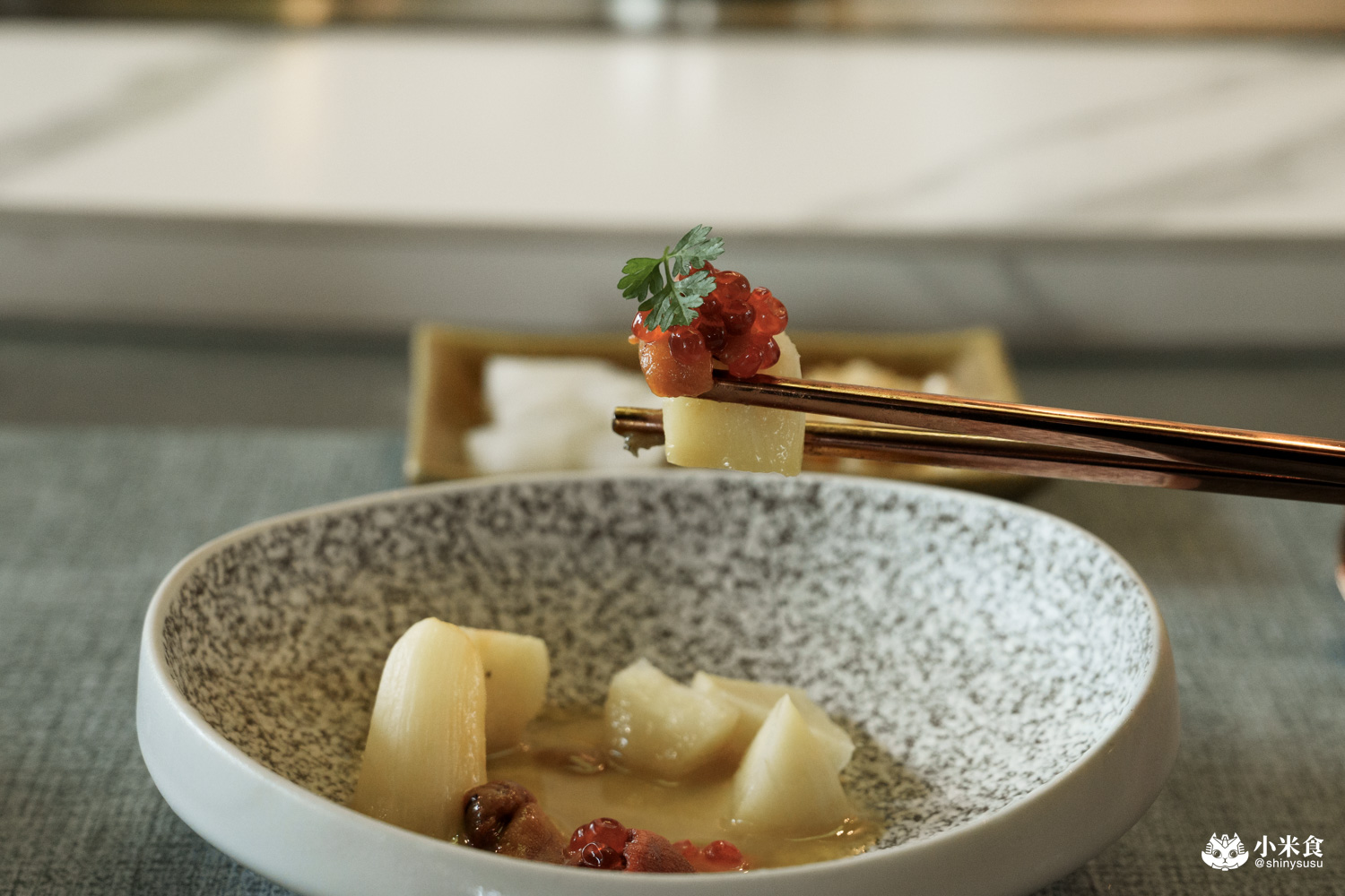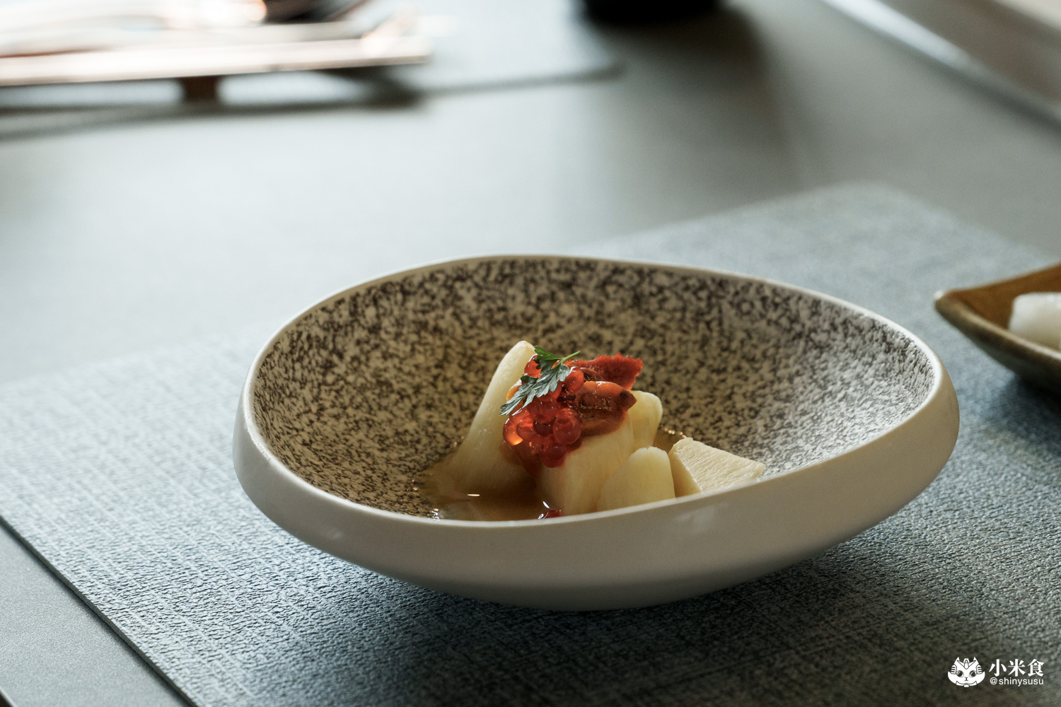 將肥厚的北海道赤海膽結合逼啵多汁鮭魚卵來加乘海味鮮美,並以皎白筍增添鮮脆與爽度
