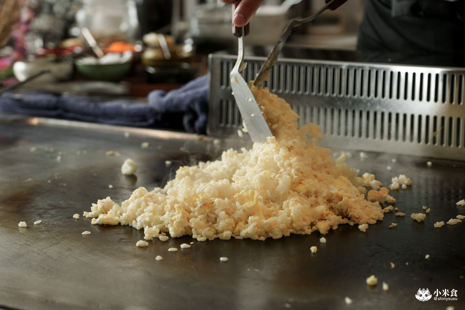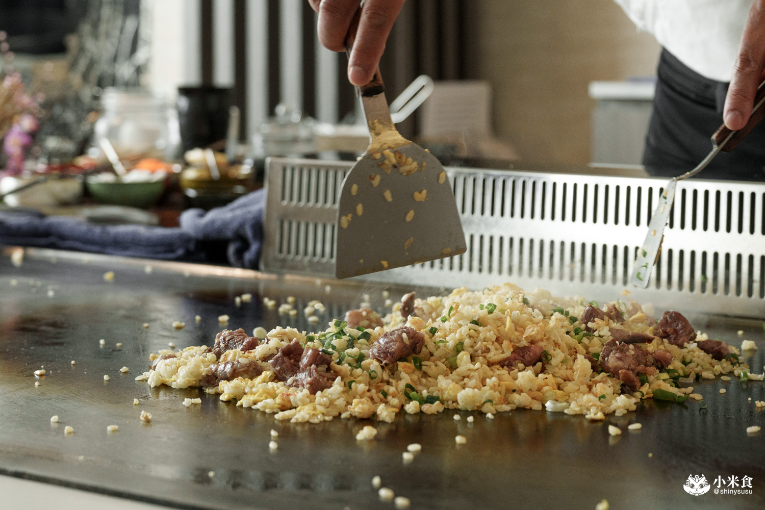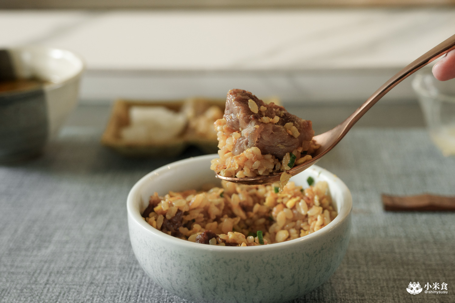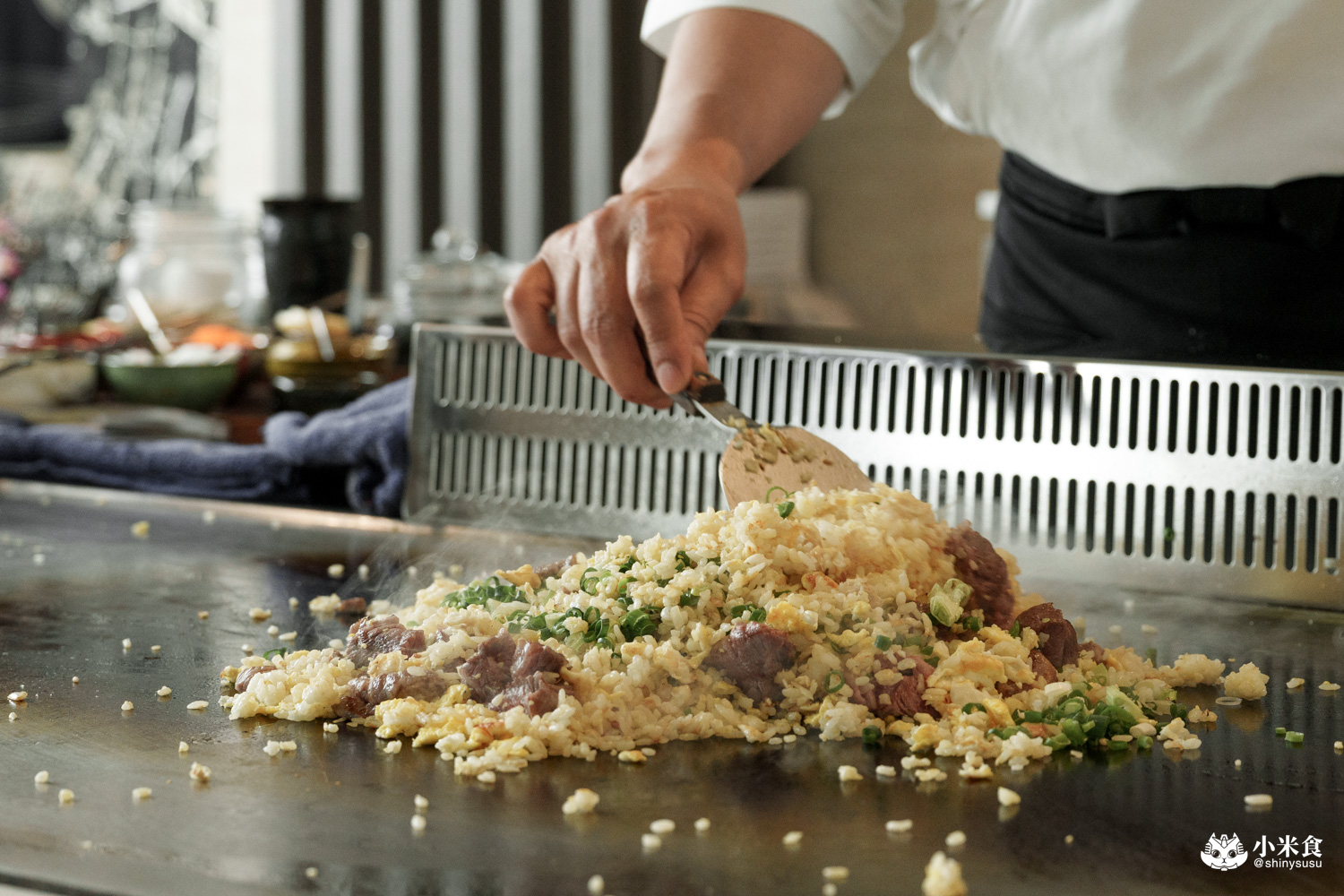 工序繁雜的牛筋炒飯也是明水然樂的一大魅力值,再訪依舊很喜歡~先將台東品選米和蛋液翻炒,牛筋也稍微煎香,再與翠綠蔥花一起炒出香氣。