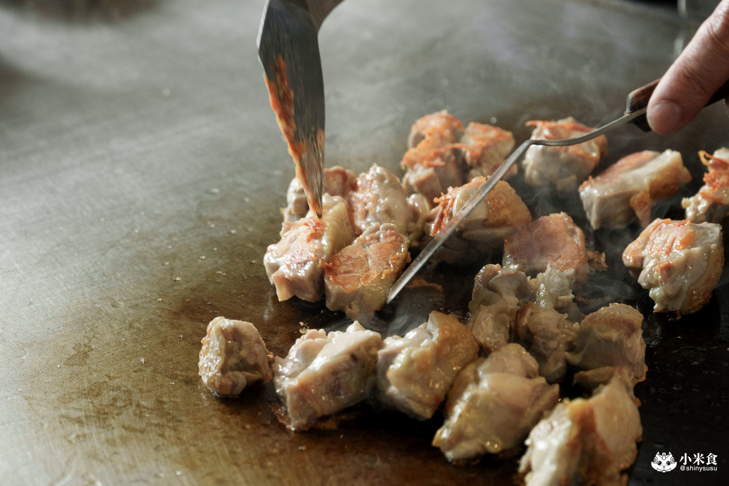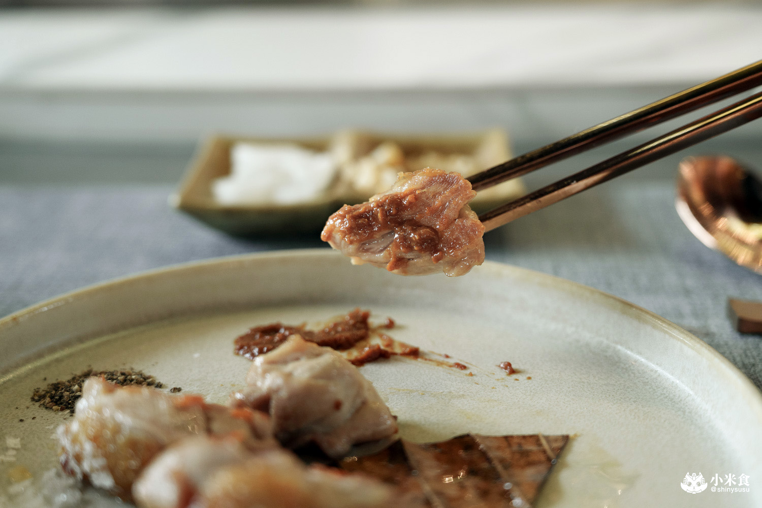悶煎至表皮焦香恰恰,腿肉Q彈紮實帶勁道,肉量十足很滿足,單吃即美味,佐黑胡椒或赤味噌醬都很對味