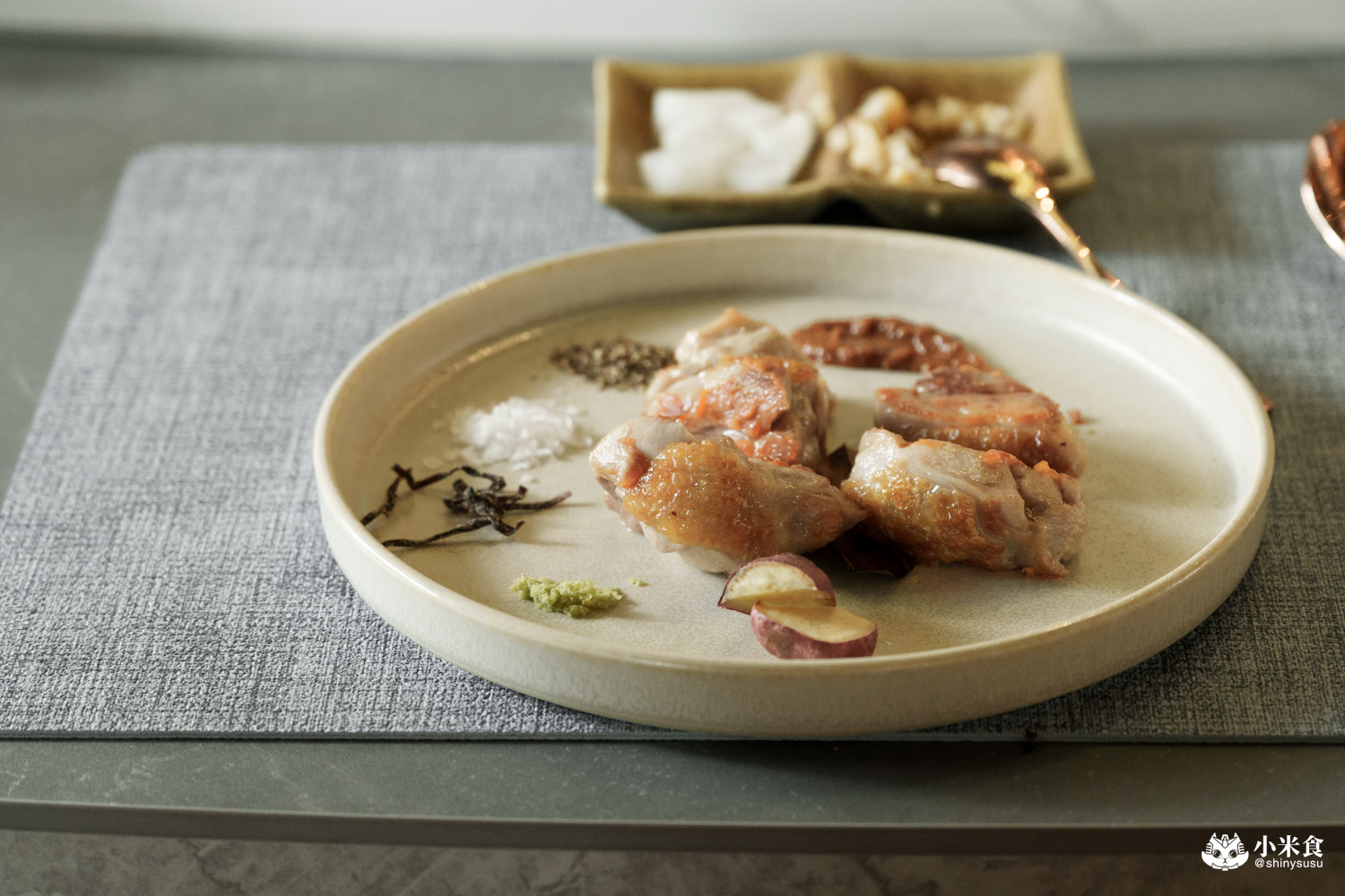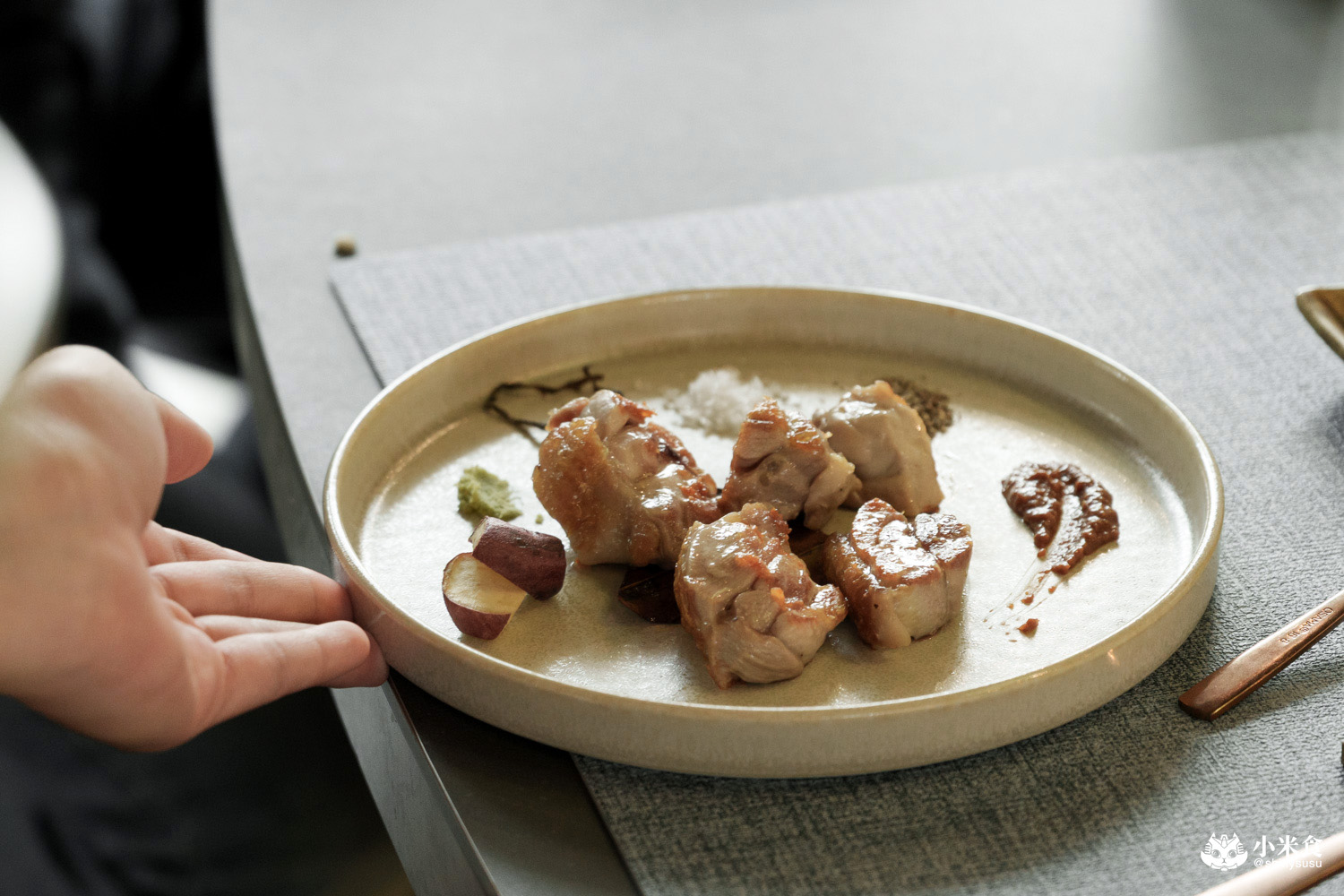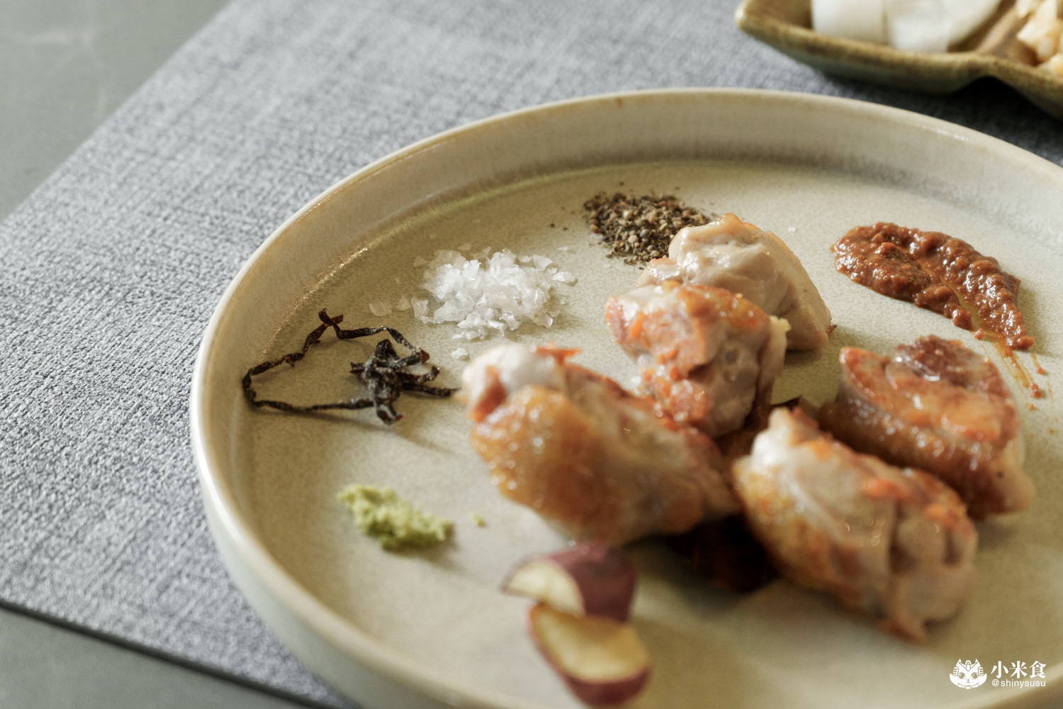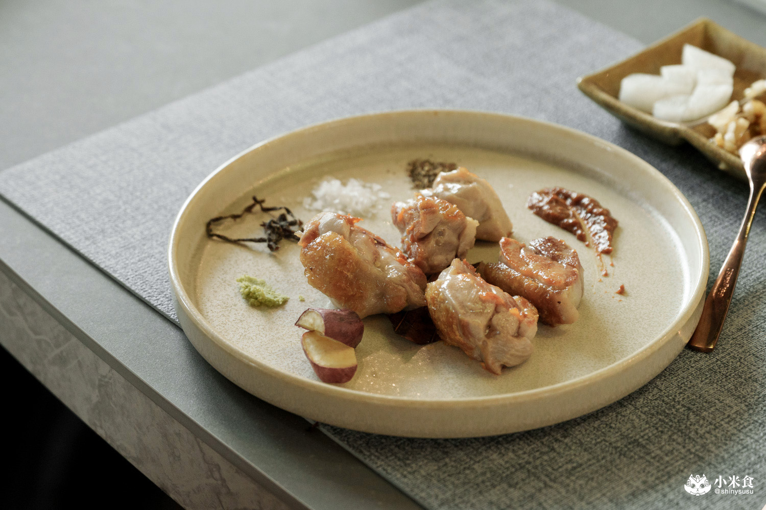 主餐佐醬提供馬爾頓片鹽、研磨山葵、大阪昆布鹽、黑胡椒與赤味噌醬,可依照喜好取用~國宴桂丁雞的光澤看著就很美味,部位為去骨大雞腿,
