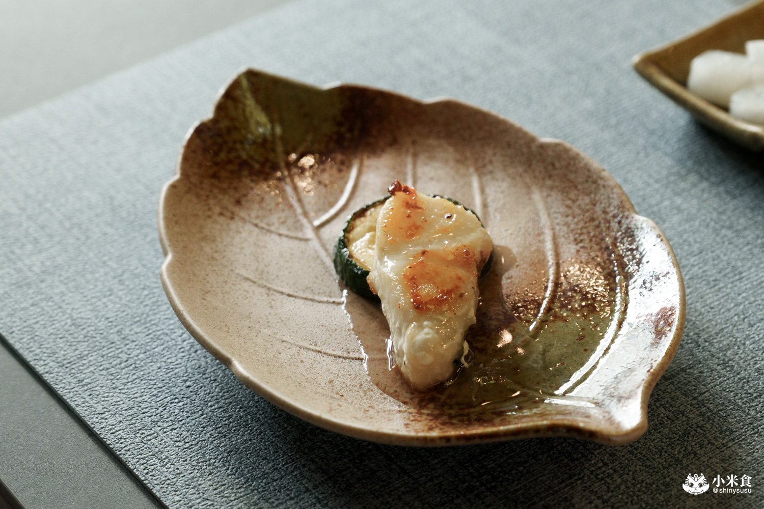 接續冷盤以星鰻為主角,又稱穴子魚,入口淡雅帶微微甜度,咀嚼細緻柔軟,搭配綠嘴葉和茭白筍添清爽,佐田樂燒醬的味噌香氣與鹹甜更開胃