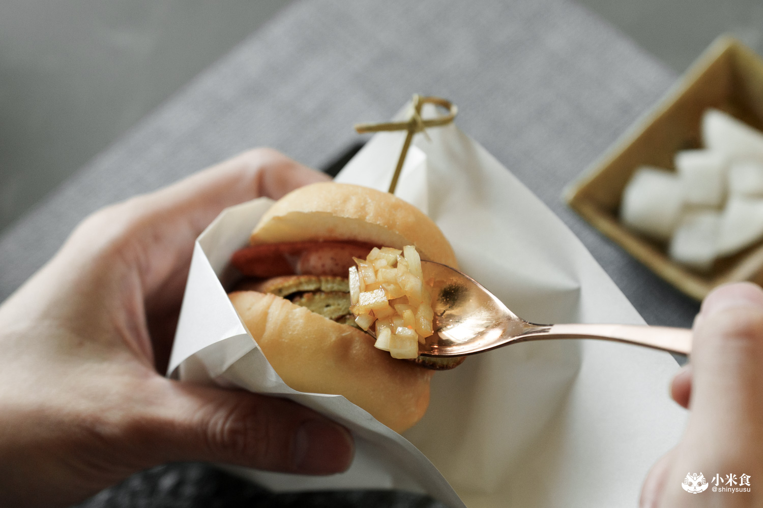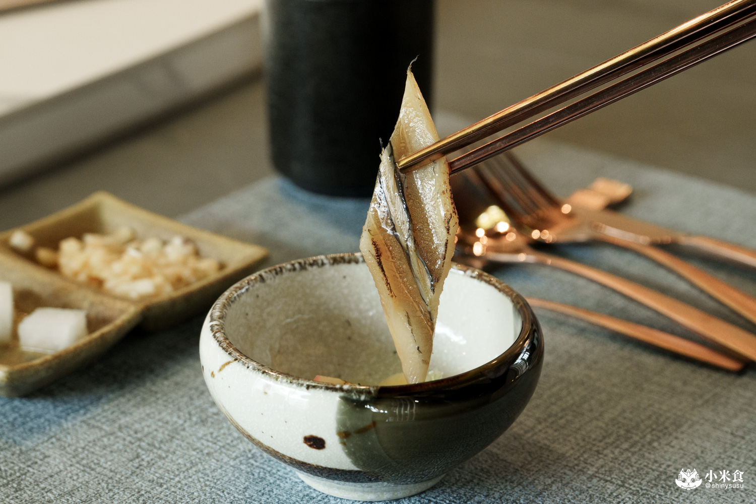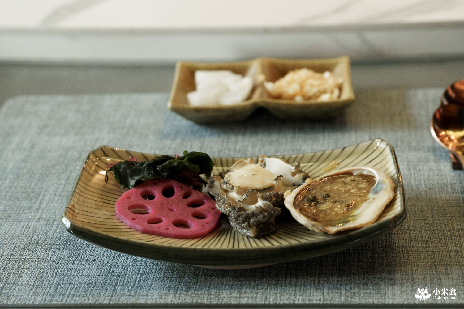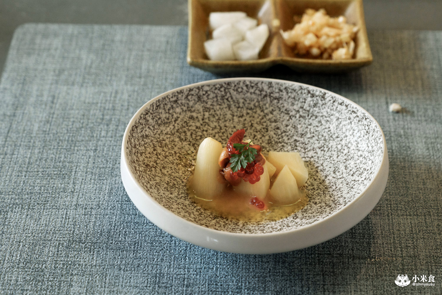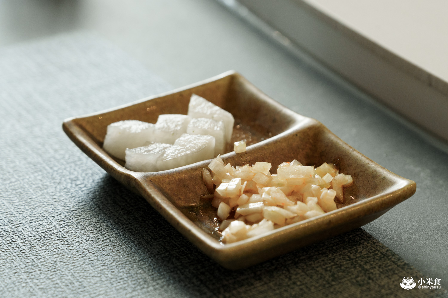 簡單清爽的漬物來打開味蕾,提供酸甜清脆又開胃的醋漬蘿蔔與蘋果洋蔥,不夠還可以續家唷