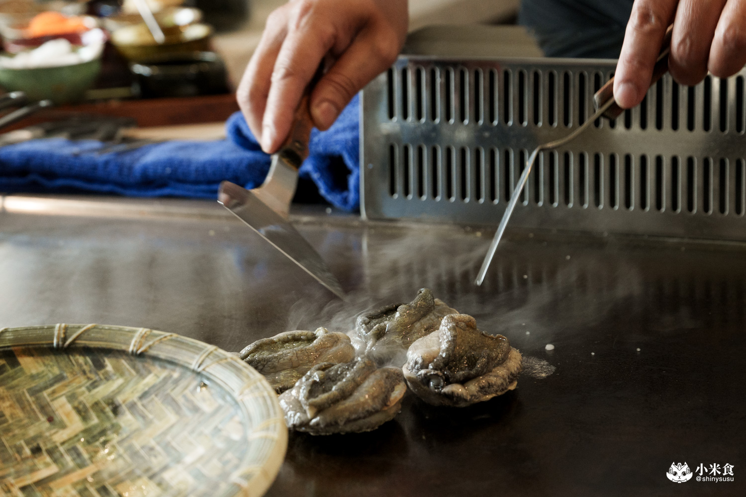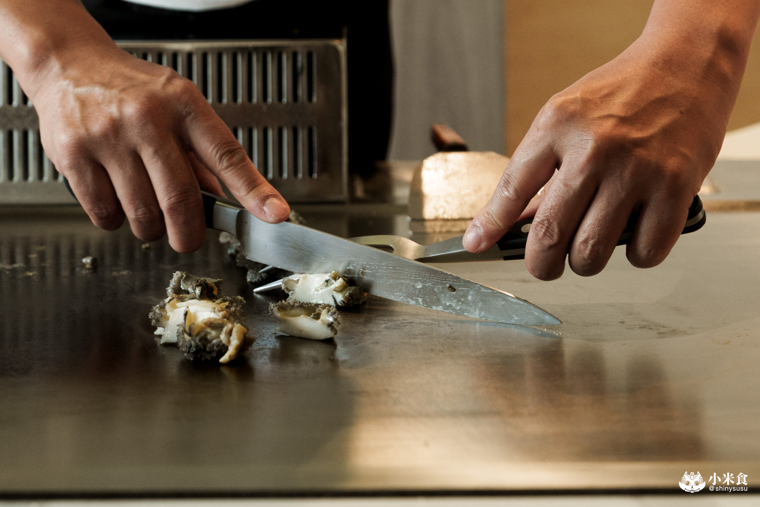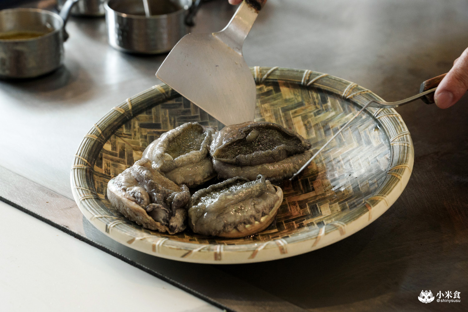 悶蒸後移除牙齒分切小塊,並將其內臟壓碎入醬,鮑肉肥彈飽滿又嫩口,佐肝醬提鮮也合拍
