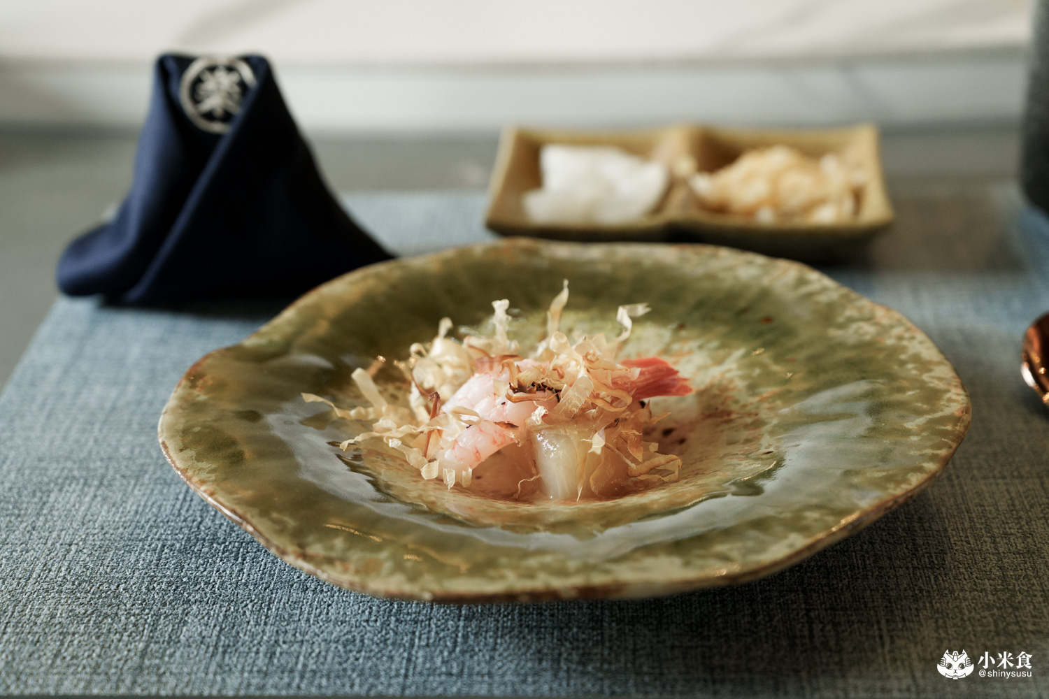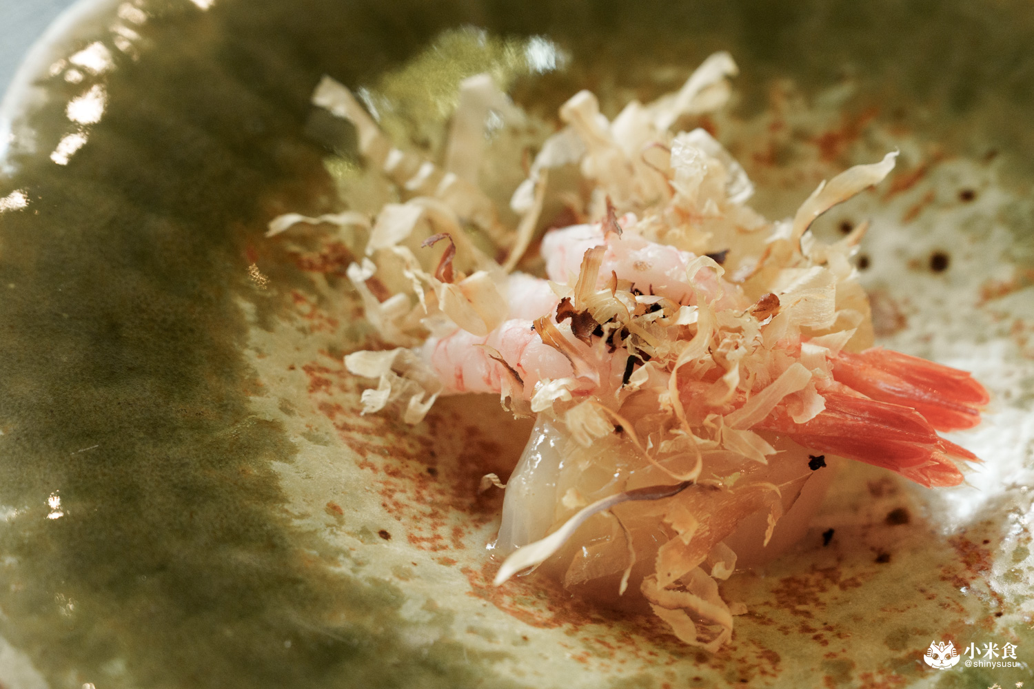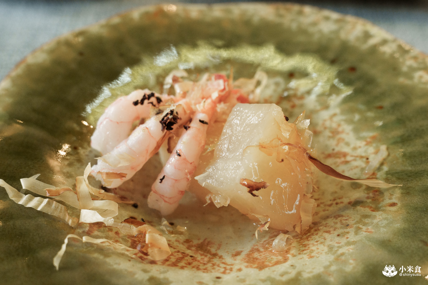以煮至焦褐上色的甜嫩大根,佐甜蝦和紫蘇鹽,搭配跳舞中的柴魚片,暖胃且溫韻舒服