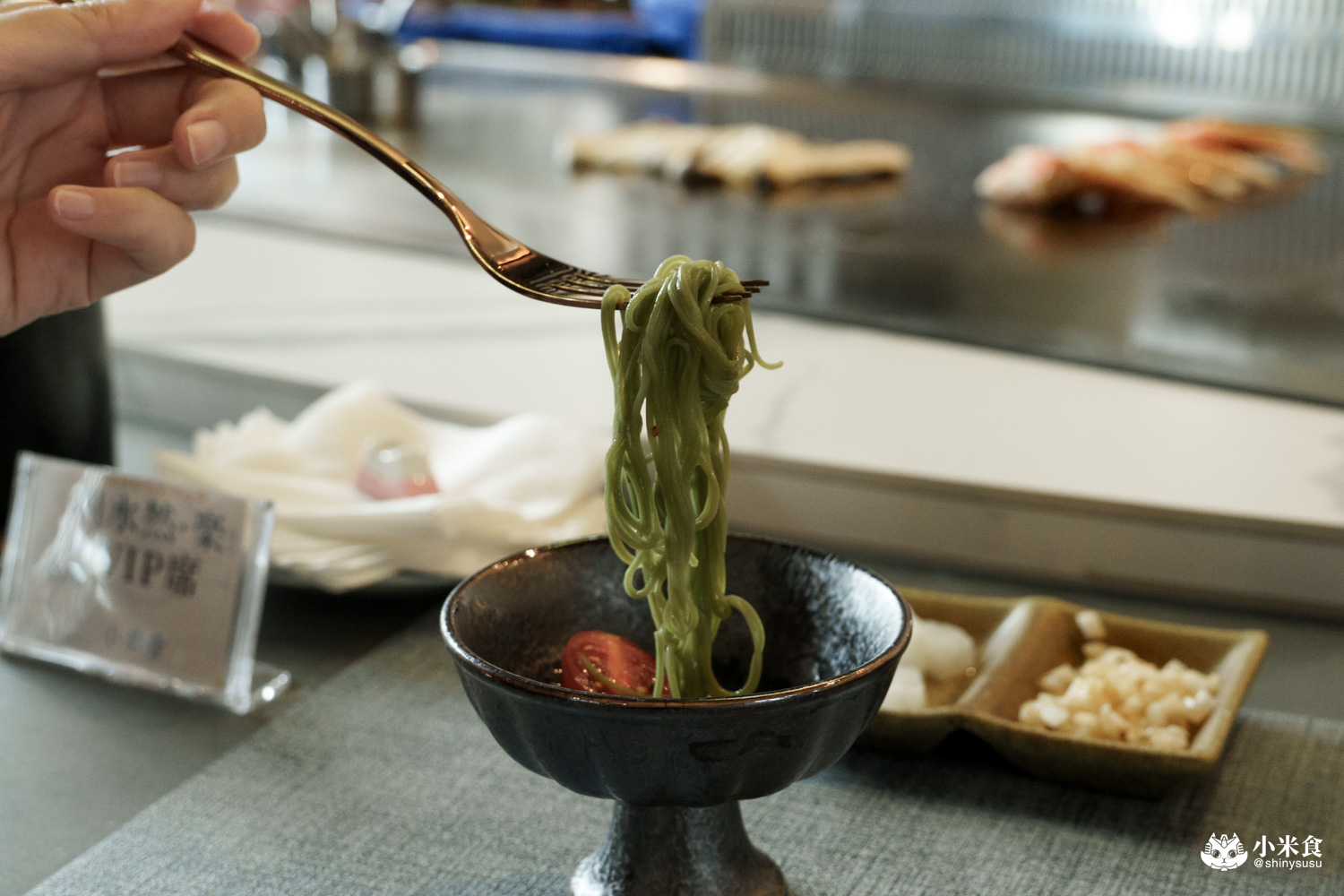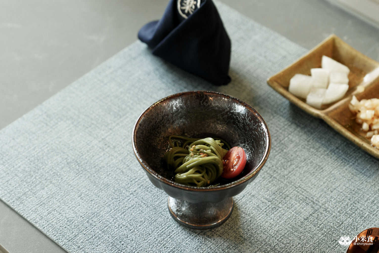 接續提供的是一道舒心涼爽的和風冷麵,以爽彈抹茶麵佐梅香醬汁,很好地打開味蕾