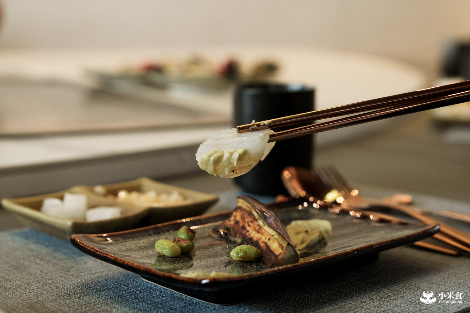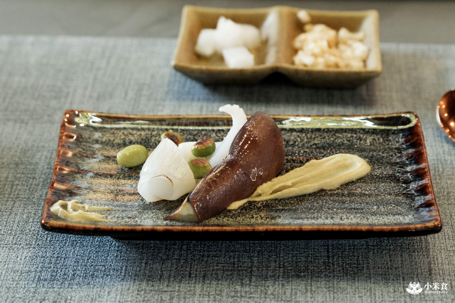 上煎台並簡單炙燒過的彈紋甲花枝,味道清香淡雅且軟嫩彈Q,搭配圓滾可愛的日本圓茄,又稱蛋茄,軟綿可口且草味較低,佐帶有淡雅芥末香氣的毛豆醬十分合拍