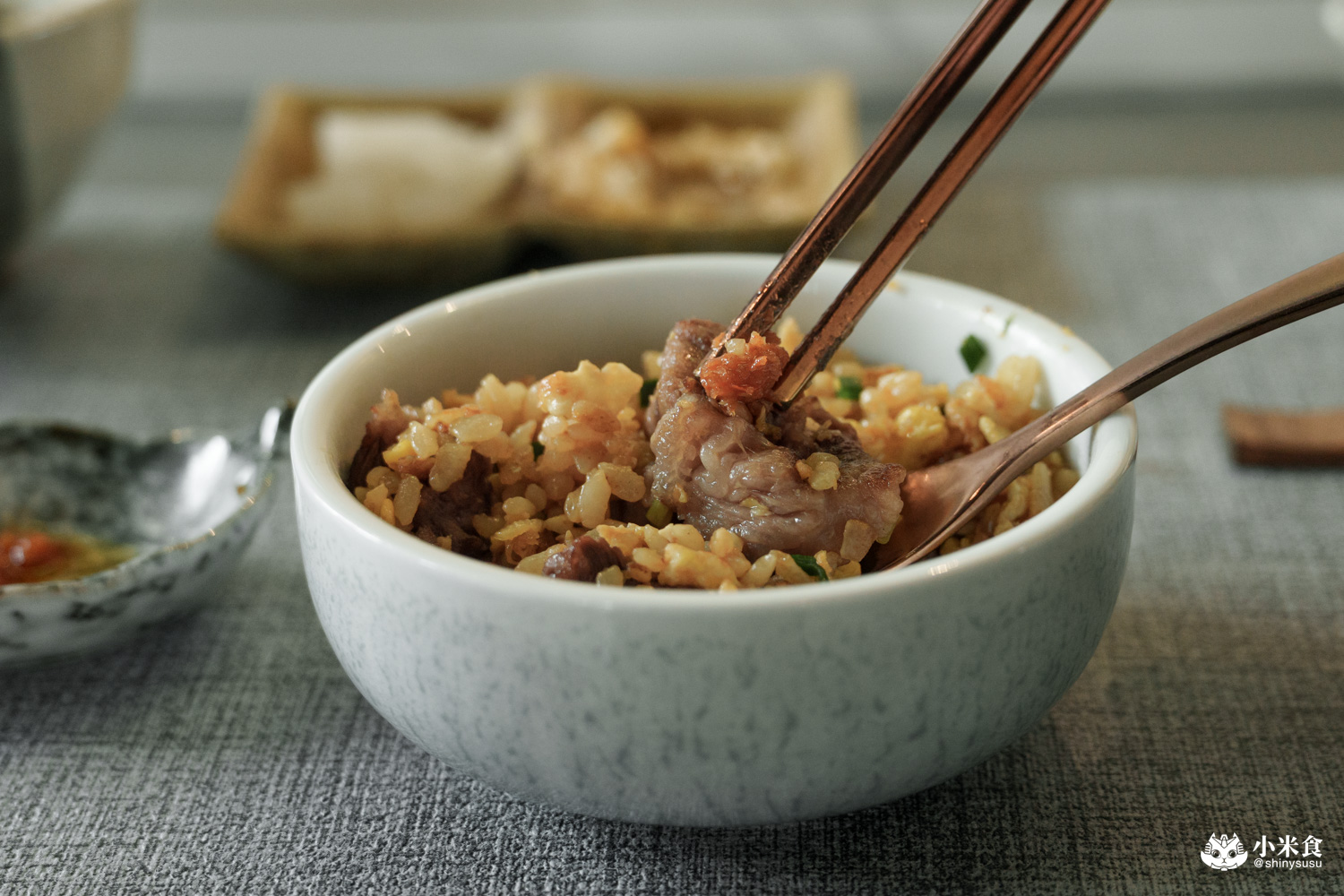 米飯炒至粒粒分明且沾附蛋香,搭配蔥花醬氣與牛筋的濃厚牛香和Q彈,推薦要添加特製辣椒醬,朝天椒、小辣椒與開陽辣椒結合出的美味辣度,舔唇美味非常讚。
