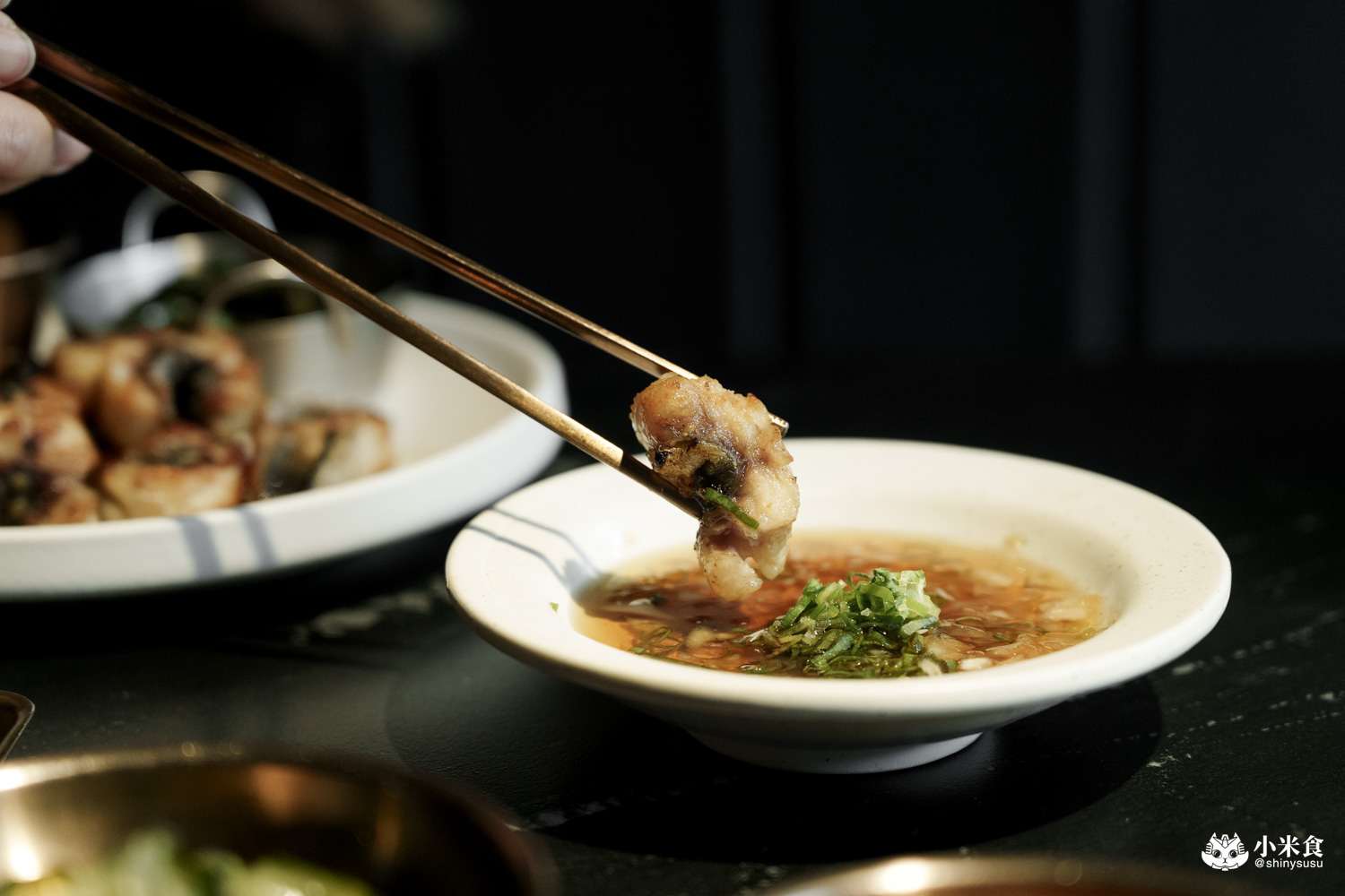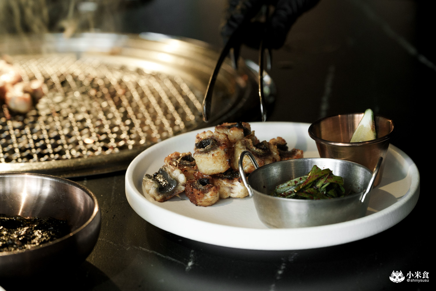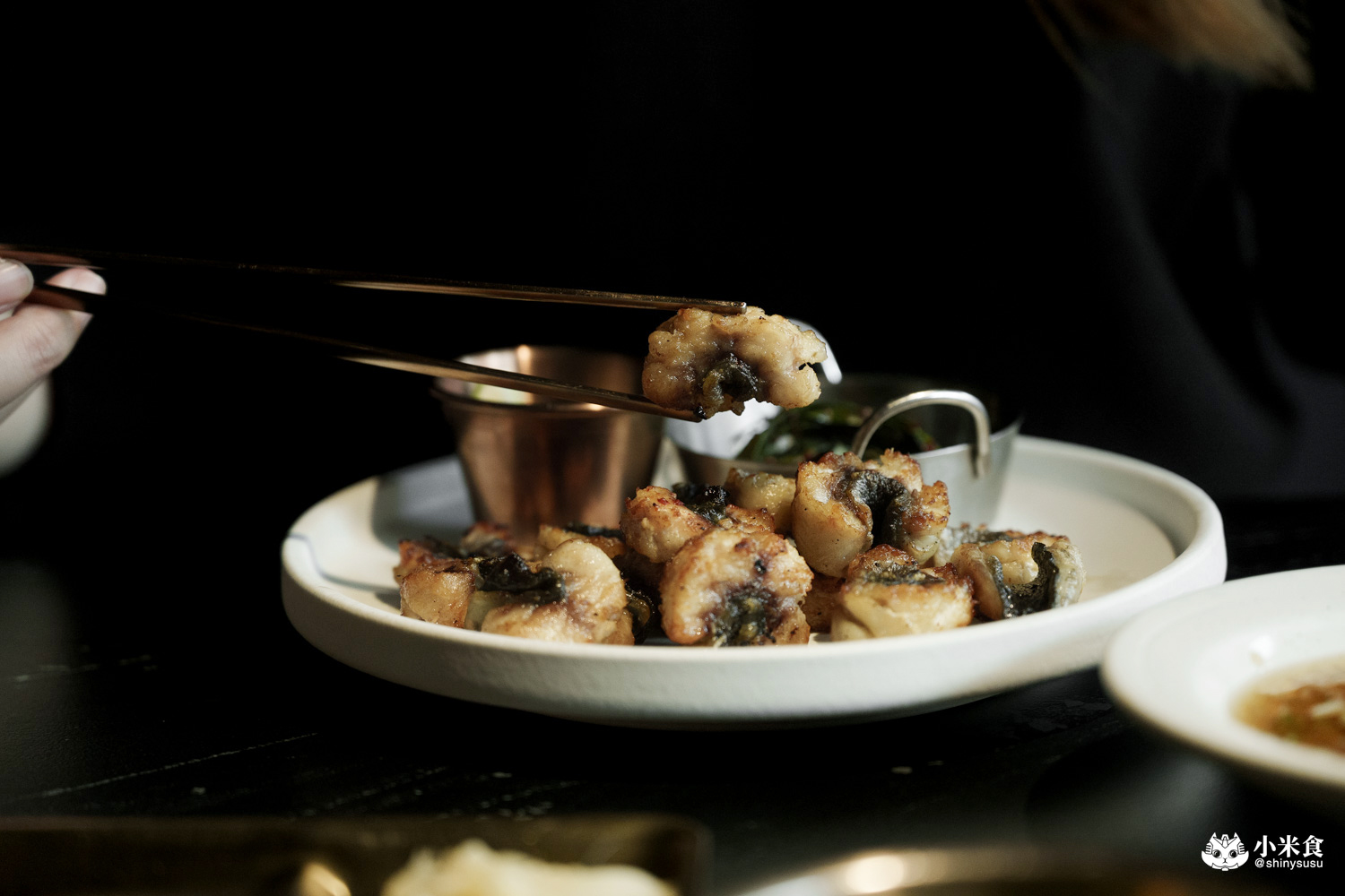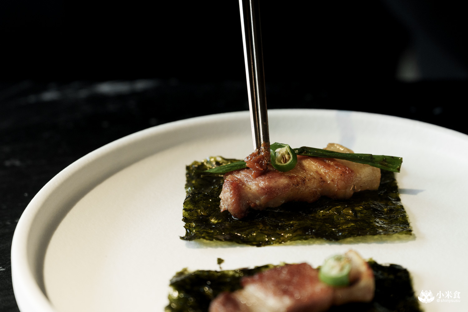 肥Q爽彈的五花以海苔包覆,佐青龍椒、芝麻油與豆瓣醬,香氣口感並具;黑鰻烤出焦脆表皮,魚肉細緻彈嫩,單吃美味,以清新洋蔥醬汁提香也不錯,或是創造自己獨特吃法麻金讚