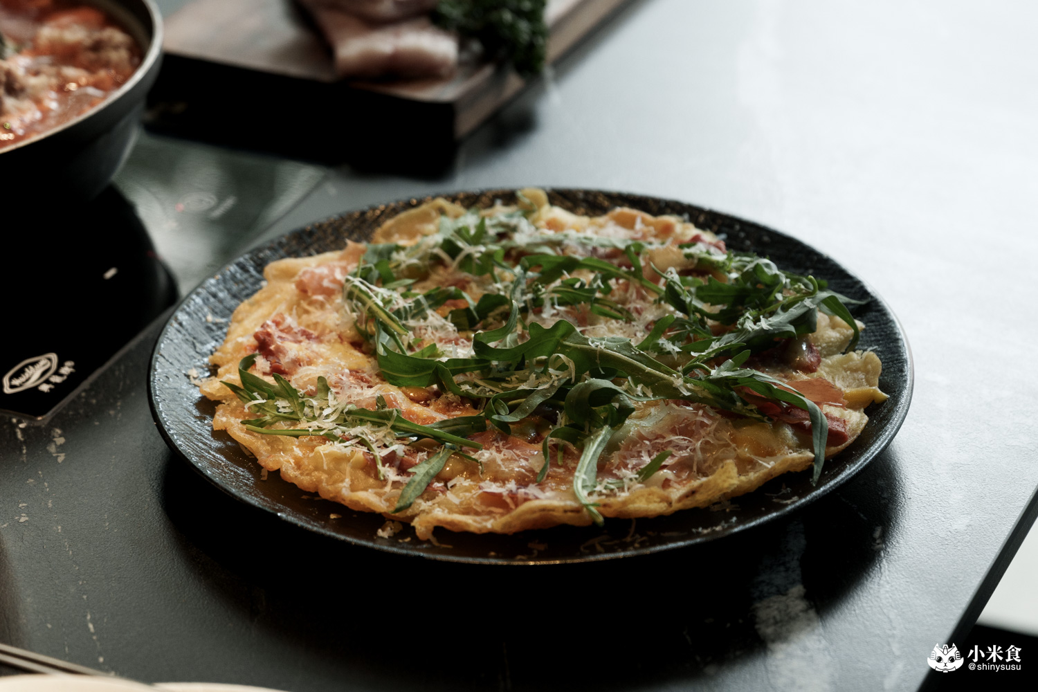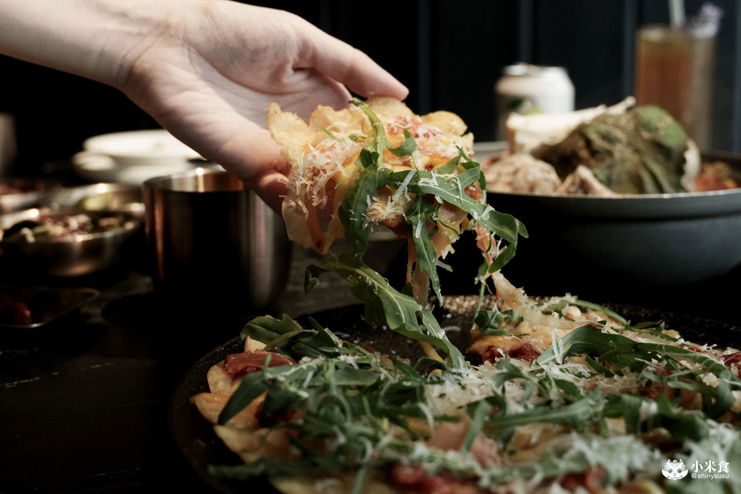 當披薩遇見韓式煎餅,脆香餅皮上佈滿芝麻葉苦甘與生火腿鮮鹹,金促咪