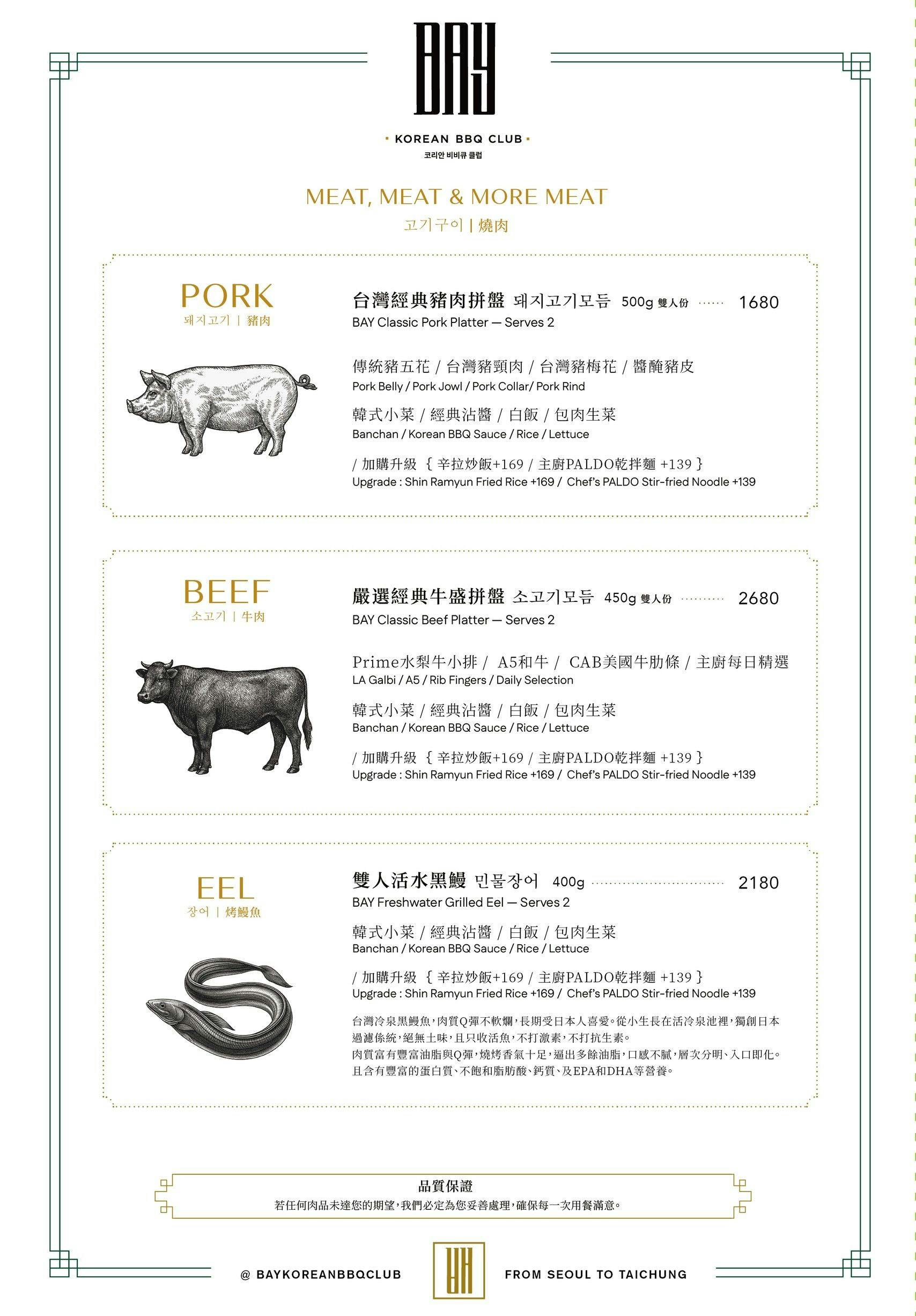 BAY Korean BBQ Club以料理×設計×音樂為核心,韓式燒肉與傳統料理為核心,結合異國食材元素與料理手法,端出新潮促咪的創意料理,推薦選擇套餐,會附贈韓式小菜、經典沾醬、白飯與包肉生菜等組合很豐富!